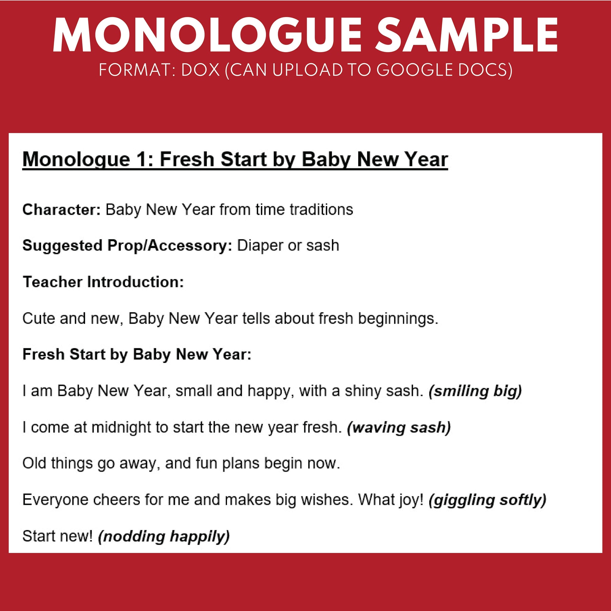 10 New Year's Day Monologues | 10 Short Scripts For Grades 1 to 3 | No Prep Activity PDF