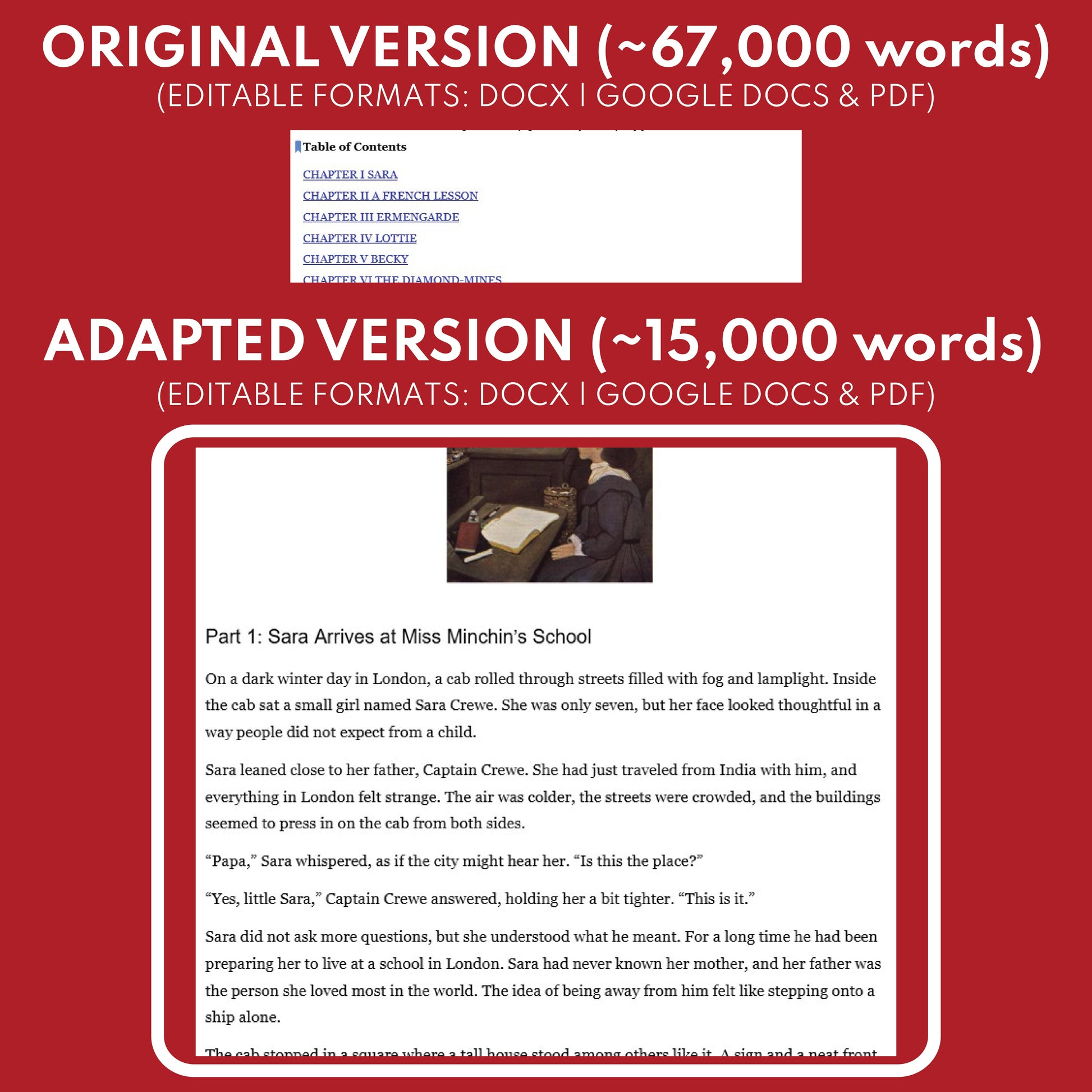 Here’s the solution: a differentiated novel study, or “digital lit-set.” This resource gives you both the complete original A Little Princess by Frances Hodgson Burnett (public domain) and a tightly adapted 5-part, one-week version at about 15,000 words—roughly about one-quarter the original length.