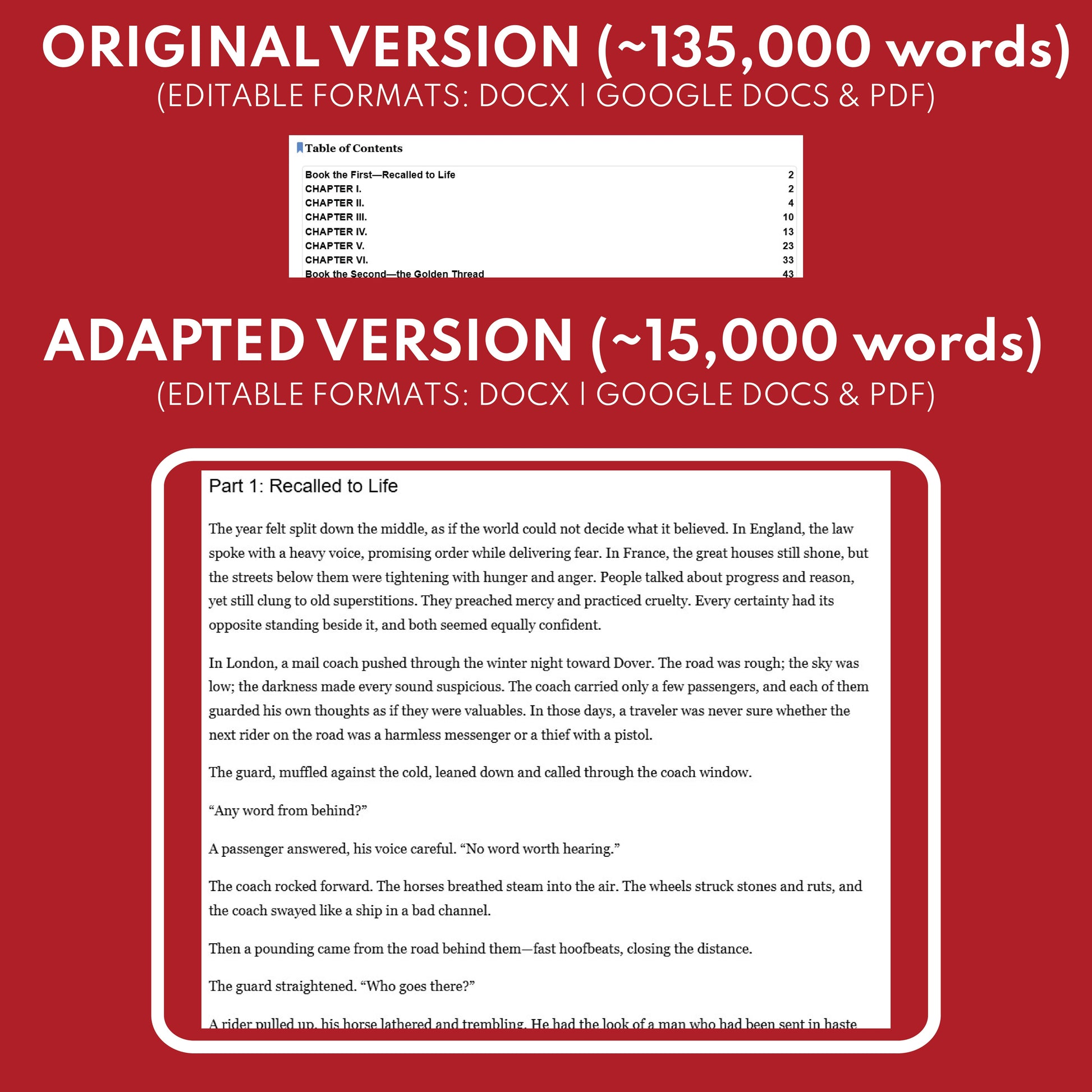 Here’s the solution: This differentiated novel study / digital lit-set solves that problem by giving you two complete reading tracks that stay perfectly aligned: the complete original text of A Tale of Two Cities plus a five-part adapted version designed for faster pacing and clearer access. The unit is mapped part-for-part to the original chapters (Parts 1–5), so students can read different versions while moving through the same storyline at the same time.