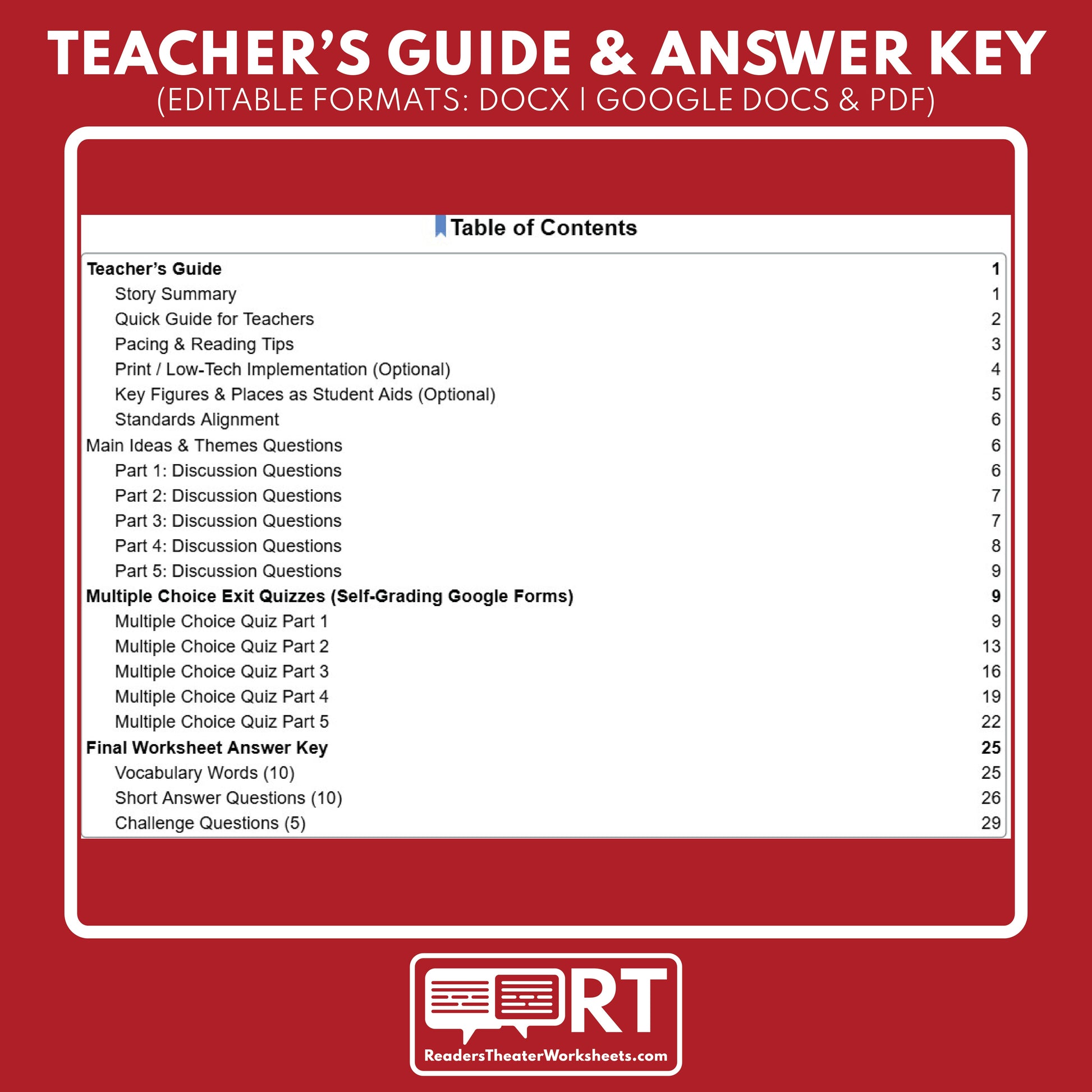 - Day 1–5: Students read one adapted part per day and use the matching Main Ideas & Themes Discussion Questions and self-grading multiple-choice quiz.