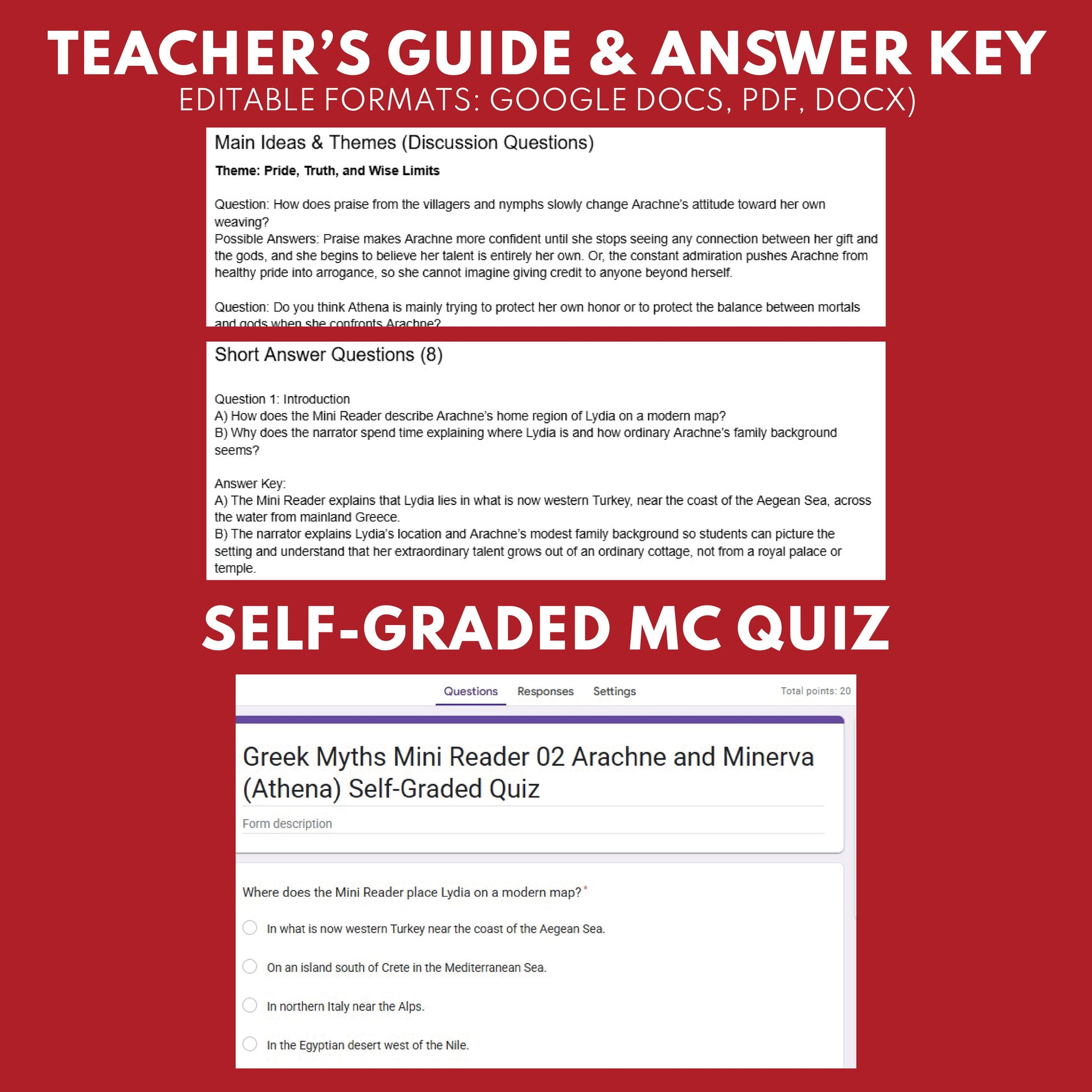 The mini reader explores key figures such as Arachne, Athena, Zeus, and Hera, explains important terms like insolence, retribution, and transformation, and highlights big ideas about pride, responsibility, truth telling, wise limits, and the dangers of defying higher powers.