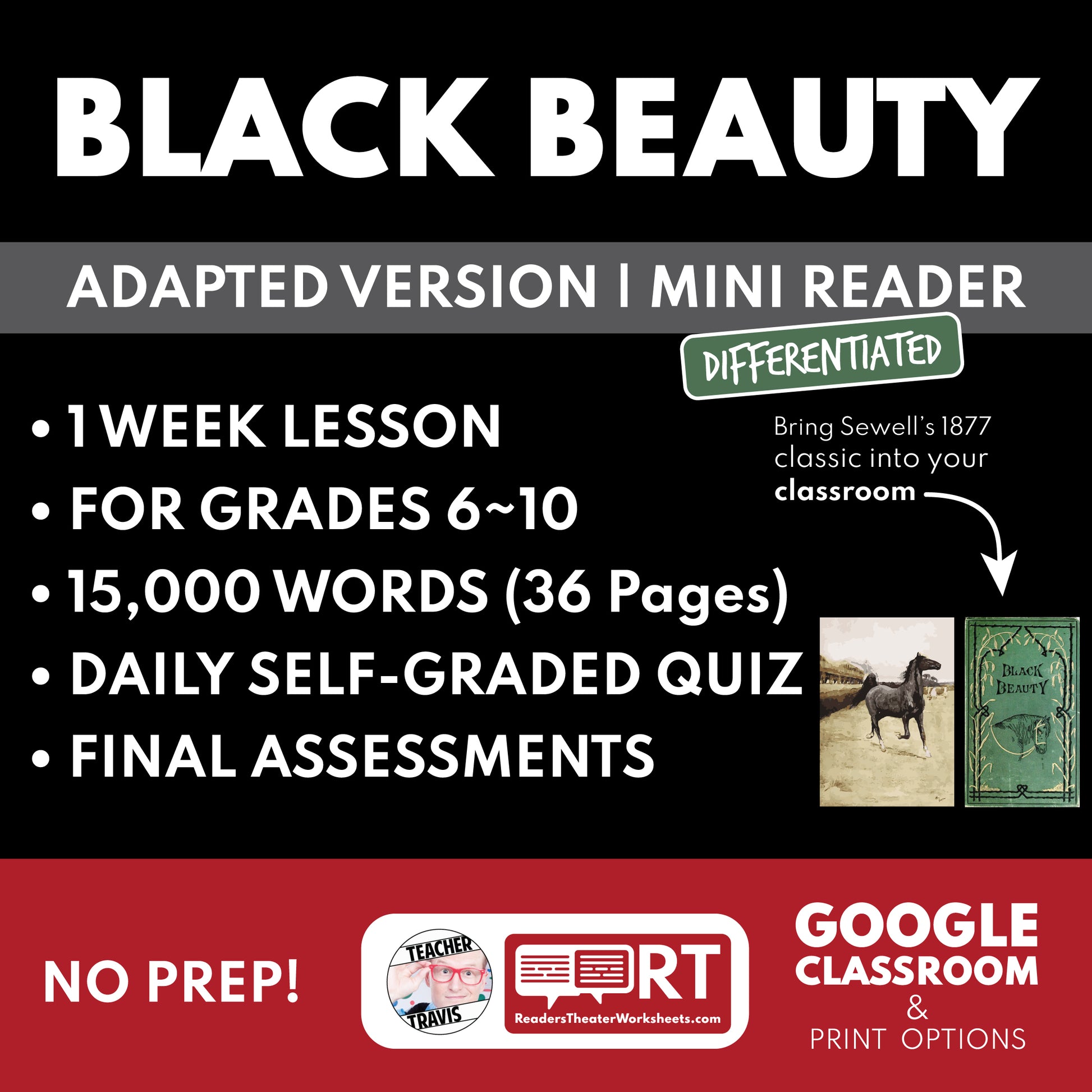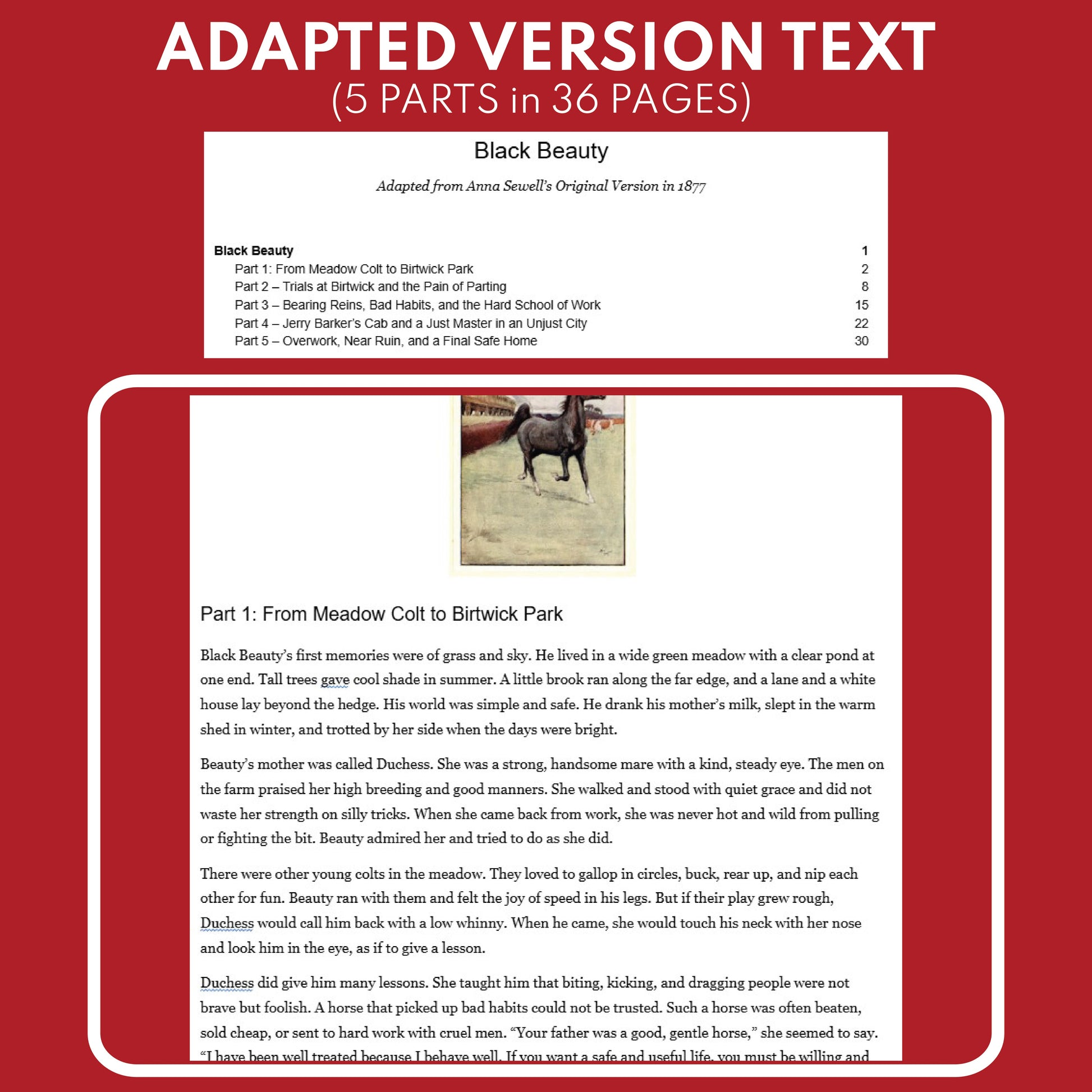 Here’s the solution: a resource that gives you both the complete original Anna Sewell text (public domain) and a tightly adapted 5-part, one-week version, so you can match the reading path to every student—without changing your assessments or losing instructional time.