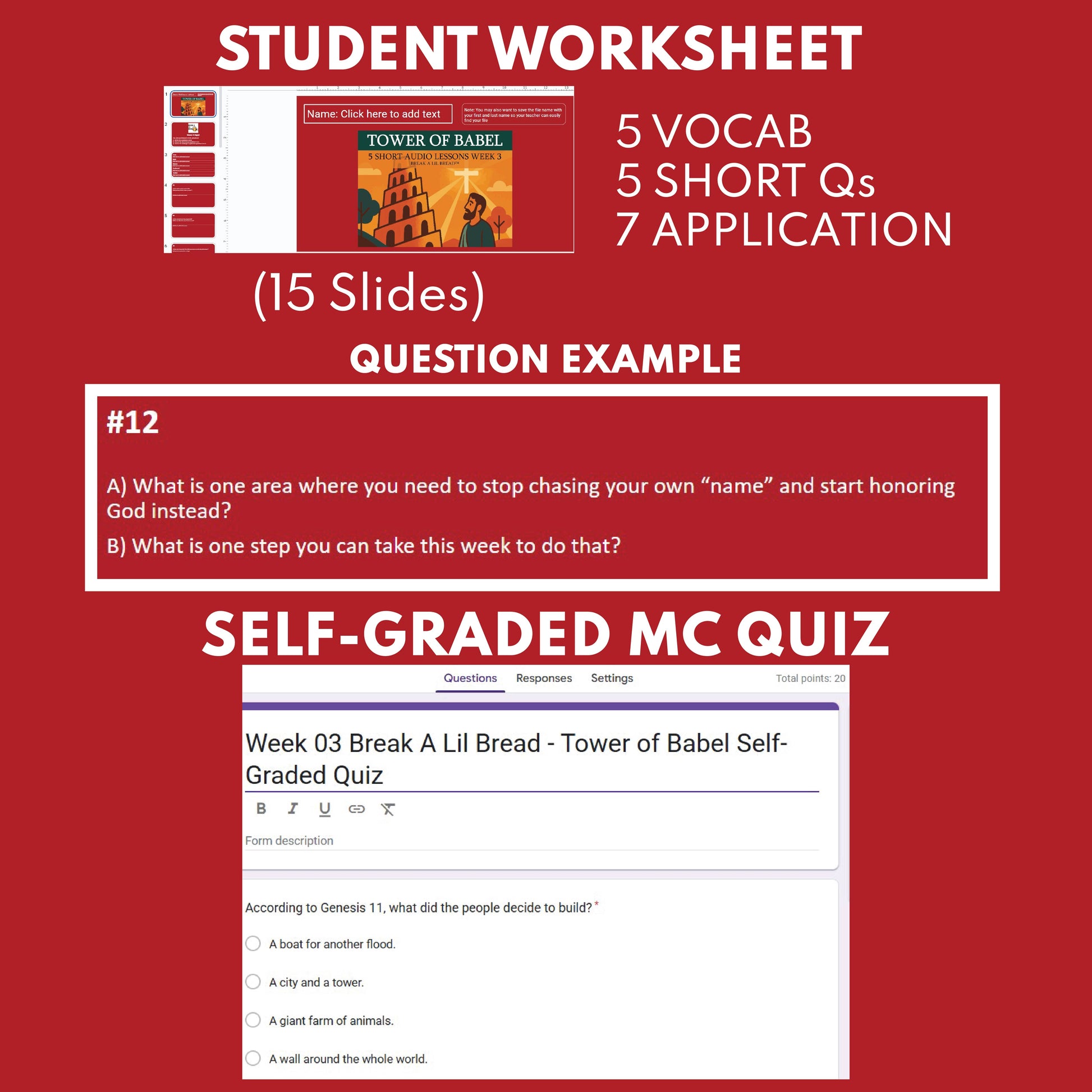 - Google Slides Worksheet: Vocabulary Words, Short Answer 1–5 (recall), Challenge Questions 6–12 (higher-order: application, inference, theme, creative, memory-verse connection, “Take Your Step” faith action)