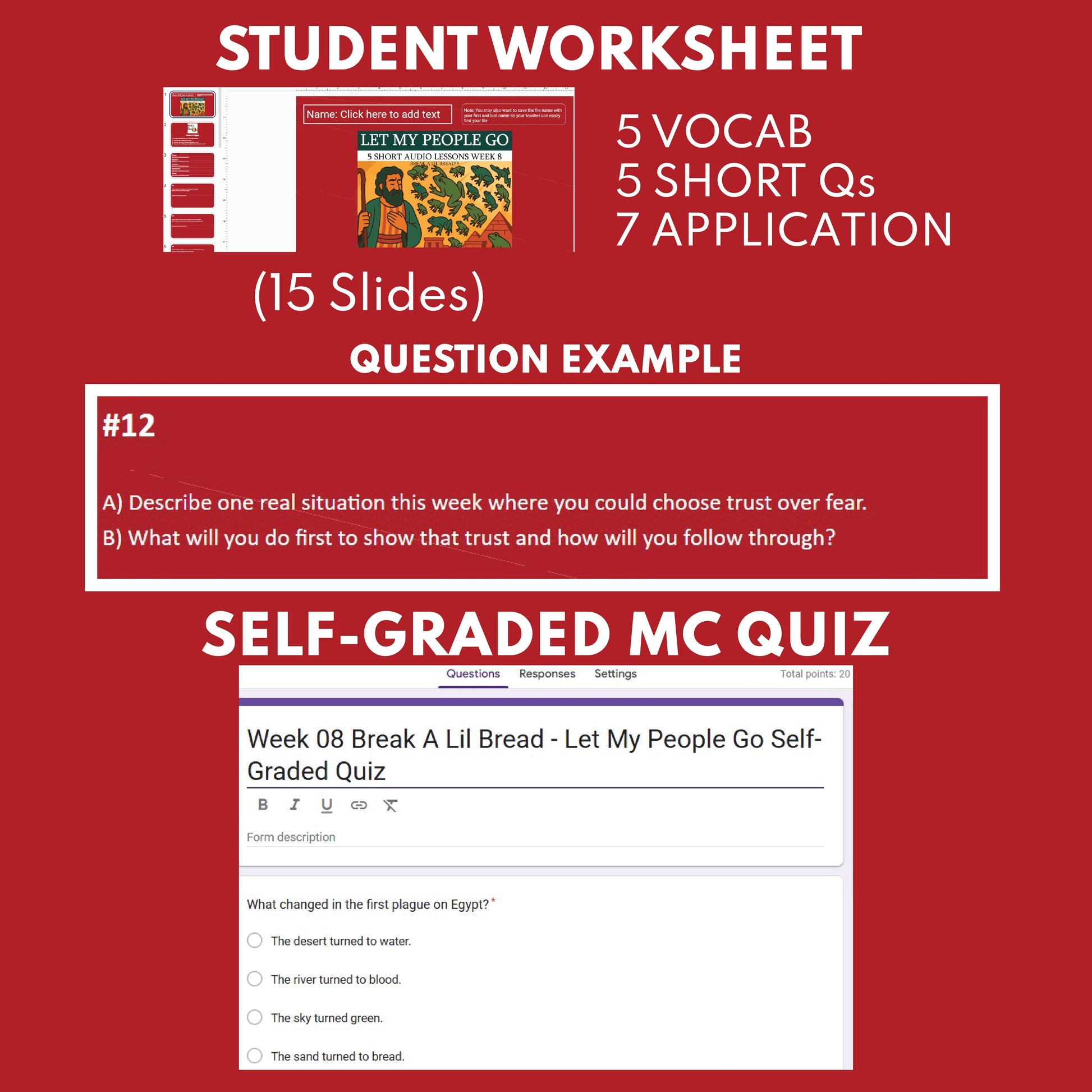 - Google Slides Worksheet: Vocabulary Words, Short Answer 1–5 (recall), Challenge Questions 6–12 (higher-order: application, inference, theme, creative, memory-verse connection, “Take Your Step” faith action)