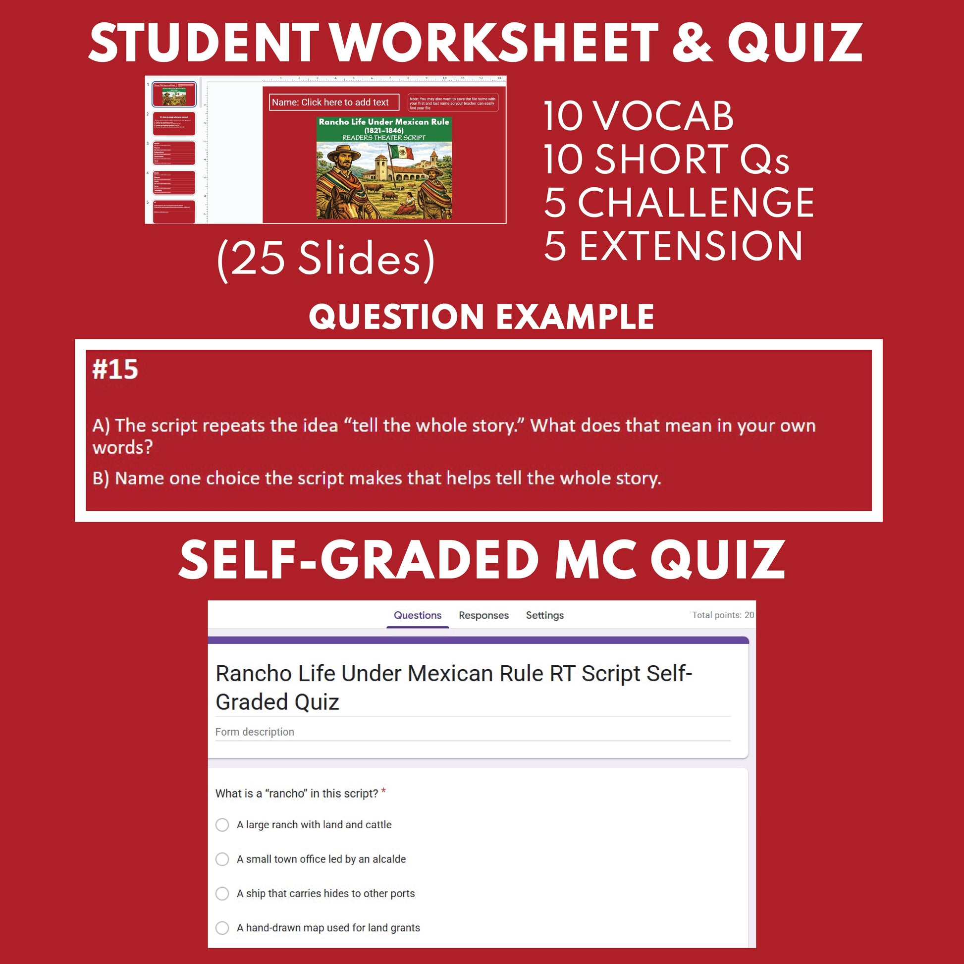 - CA HSS 4.2: Students learn social, political, cultural, and economic life during the rancho era (e.g., SAQ 1–10, Themes 1–5).