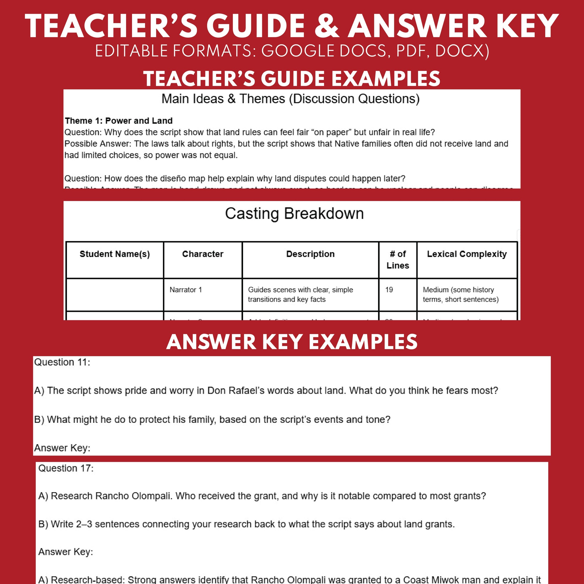 - Teacher Guide: Editable, ~12 pages, lesson tips, main ideas, answer keys, standards, casting with lexical levels (DOCX/PDF/Google Doc).