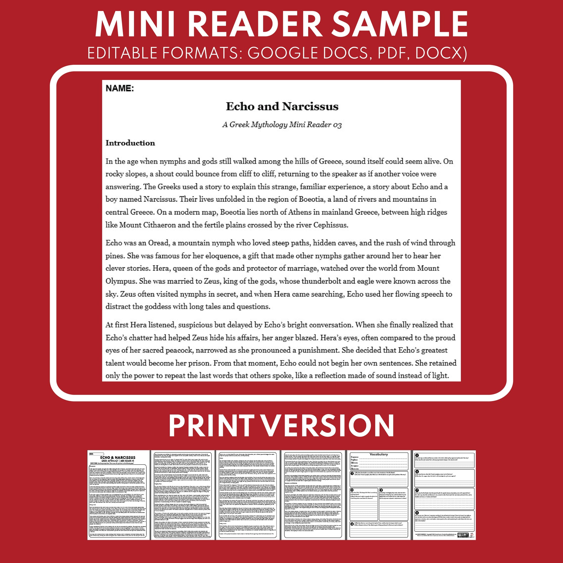 This Greek Mythology Reading Resource “Mini Reader” is based on the myth of Echo and Narcissus, retelling how Echo loses her independent voice through Hera’s curse and how Narcissus’s prideful self-love leads him to fall in love with his own reflection and vanish beside a still pool. Set in the forests, mountains, and rivers of Boeotia in central Greece, the narrative blends vivid storytelling with short explanatory pauses so students can see how gods, nymphs, prophets, and ordinary mortals are connected.