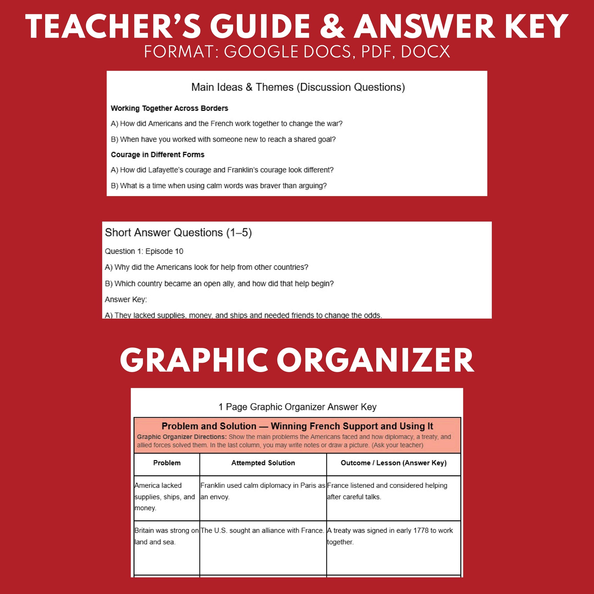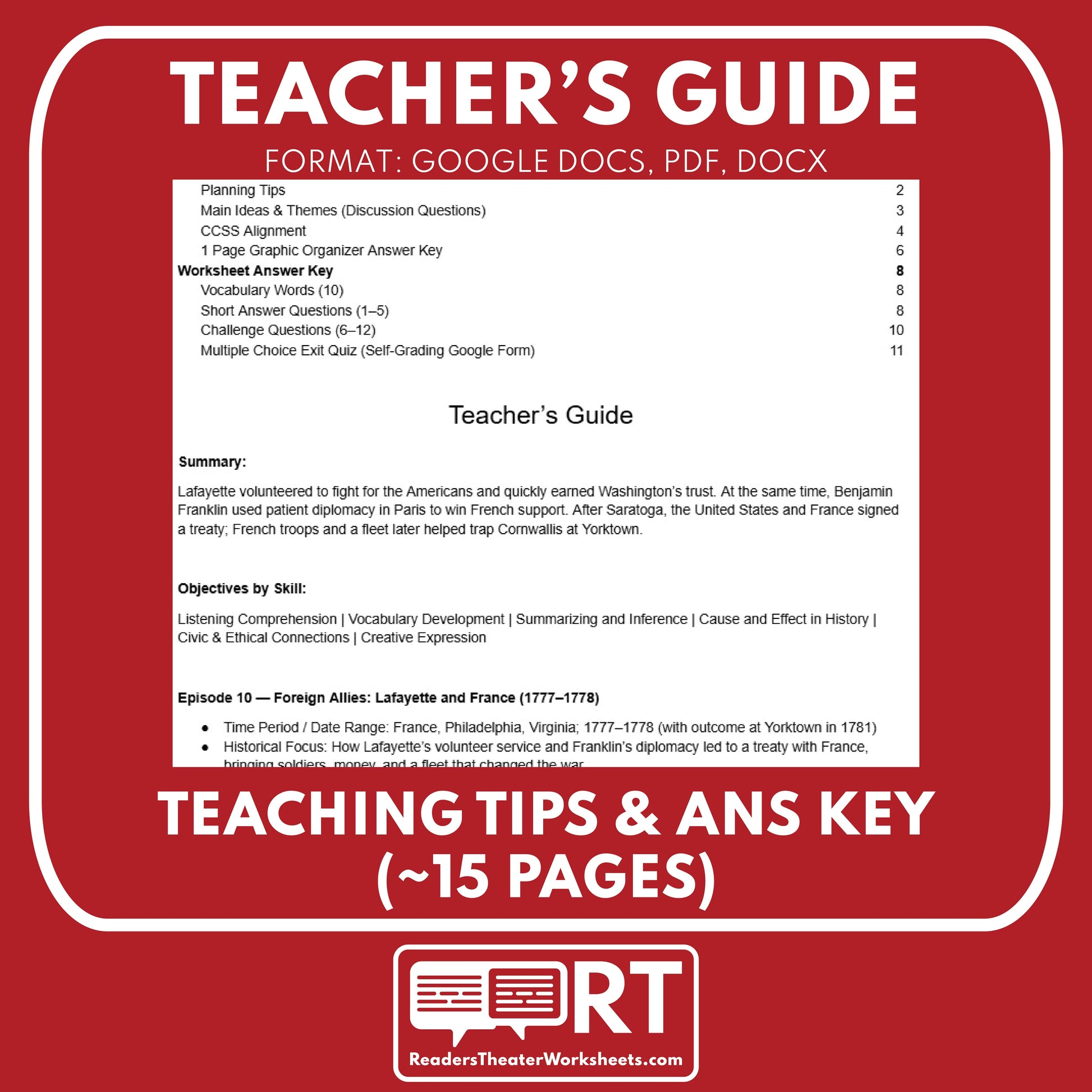 Use this Revolutionary War audio mini-lesson when you want to connect diplomacy, alliances, and battle outcomes in one clear story. It gives you ready-made tools to discuss how trust, treaties, and combined land-and-sea power helped move the war toward victory, with flexible worksheets and a self-grading quiz to reinforce key ideas.