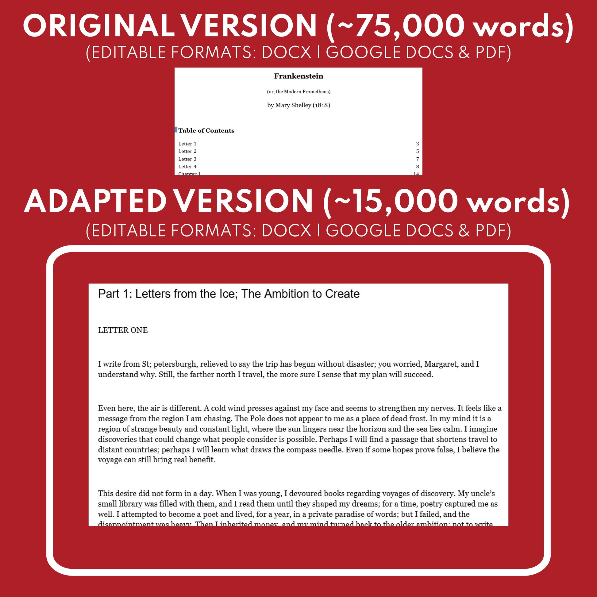 SOLUTION: This differentiated novel study / digital lit-set for Frankenstein by Mary Shelley solves that problem by giving you both the complete original text and a condensed, five-part adapted version, so you can keep the class moving together while students read at the level that fits.