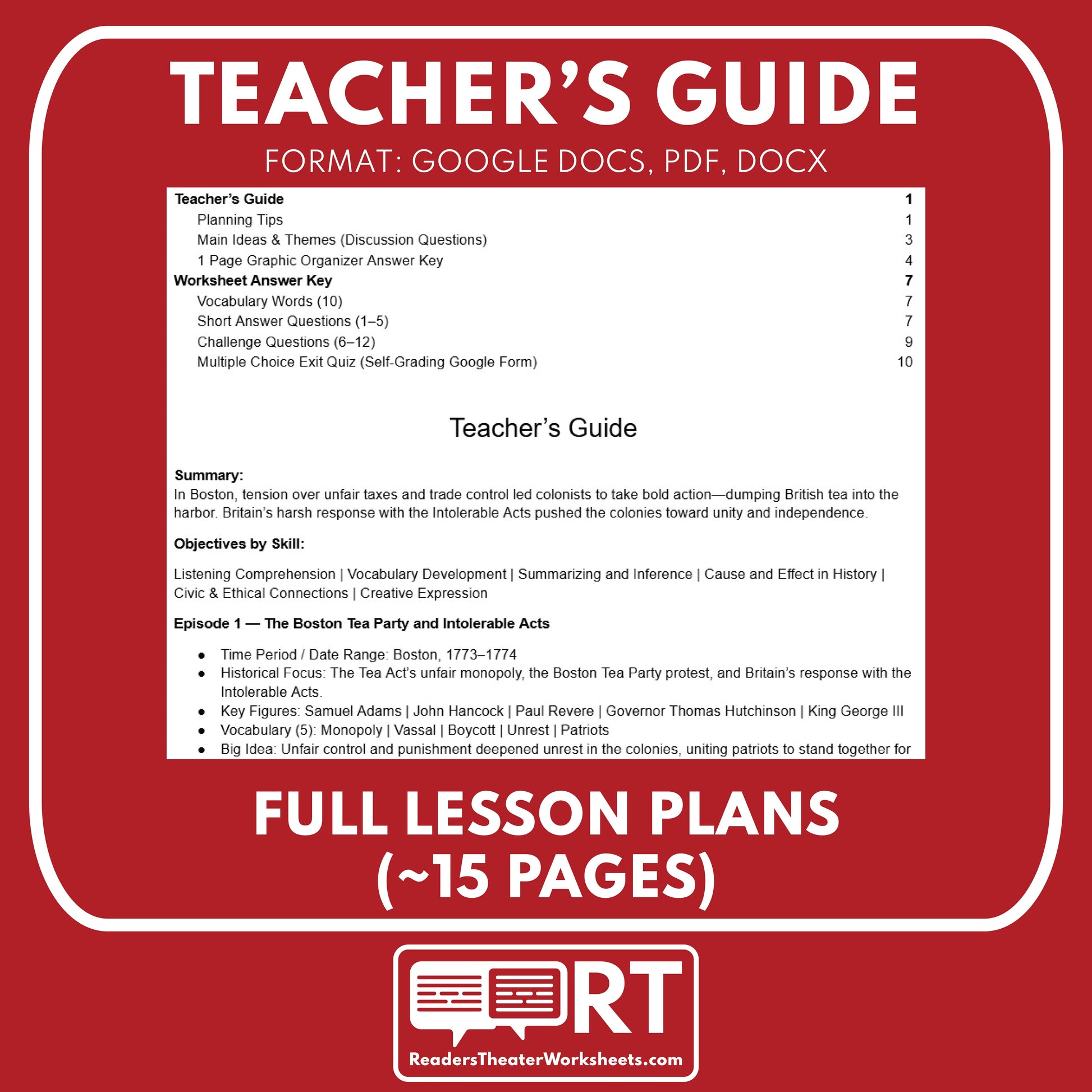 This is lesson is E01 within the Revolutionary War Audio Stories. These are curriculum-style audio mini-lessons built for real classrooms with ready-to-use assessments that line up with social studies standards. Press play, then discuss or assign the flexible worksheet & assessments—no extra prep.