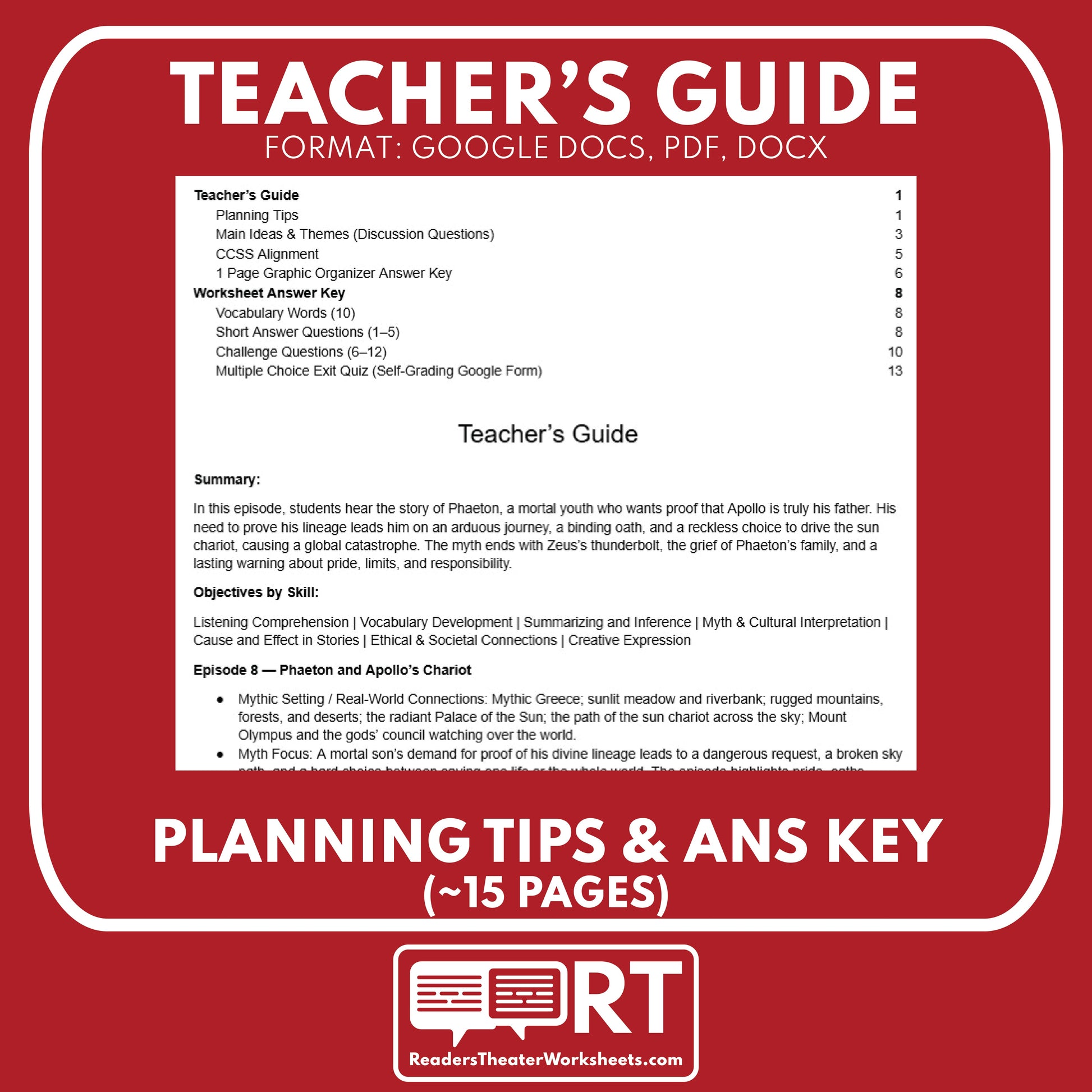 This lesson is E08 within the Greek Mythology Series. These are curriculum-style audio mini-lessons built for real classrooms, with ready-to-use worksheets and assessments that line up with ELA and social studies literacy standards. Press play, then discuss or assign the flexible activities—no extra prep.