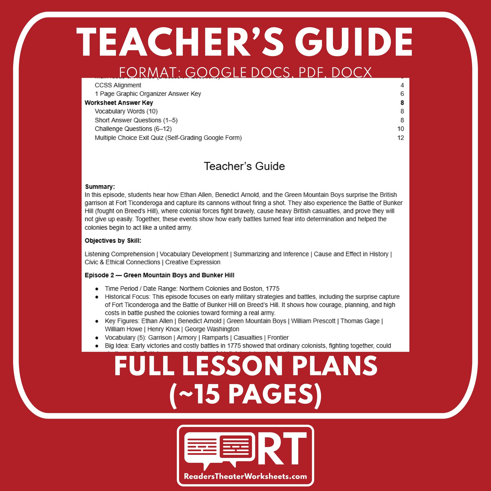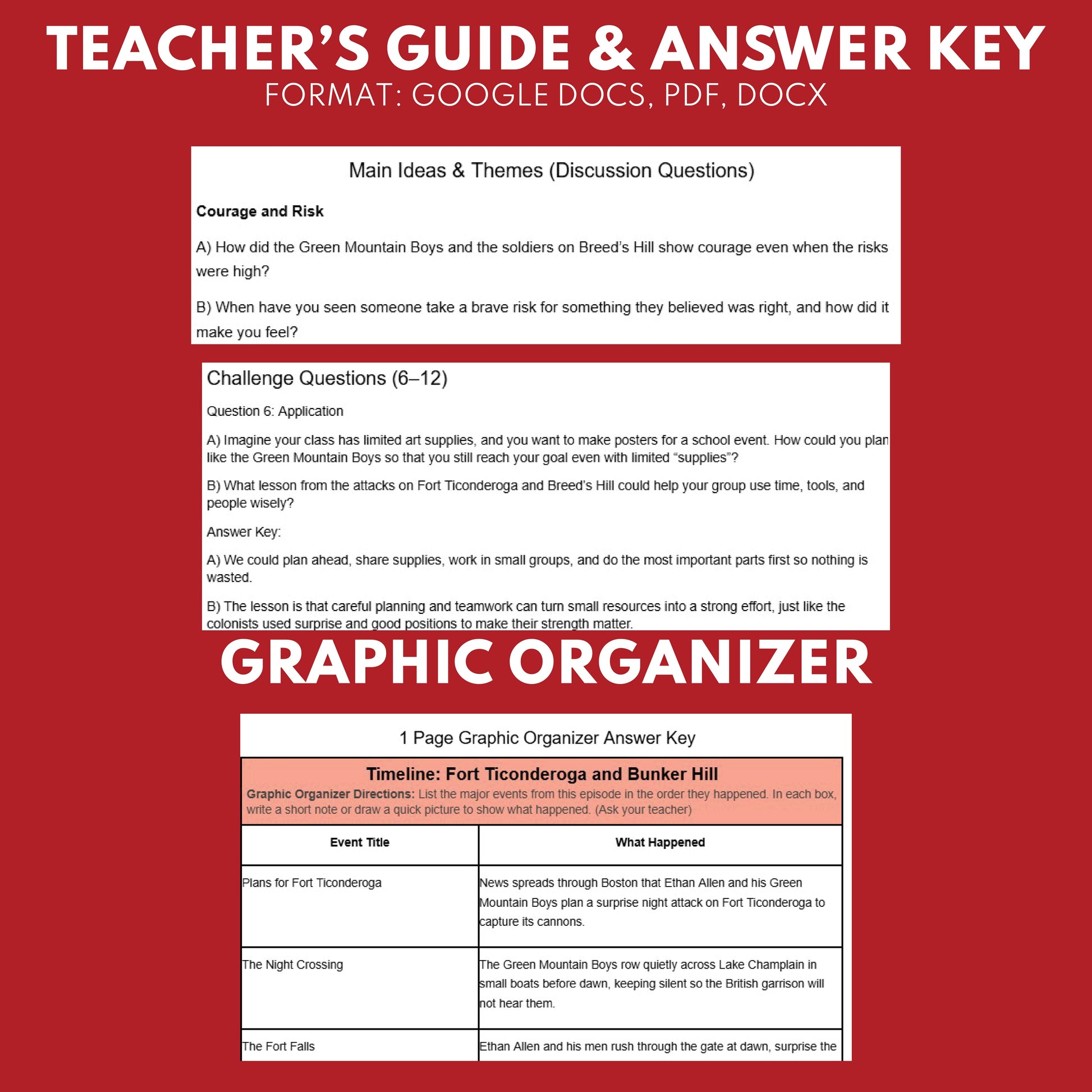 Show students how early battles tested colonial courage with an audio lesson on the Green Mountain Boys and Bunker Hill. They hear the surprise capture of Fort Ticonderoga, follow cannons and commanders, and stand with soldiers on the heights above Boston as British attacks come again and again.