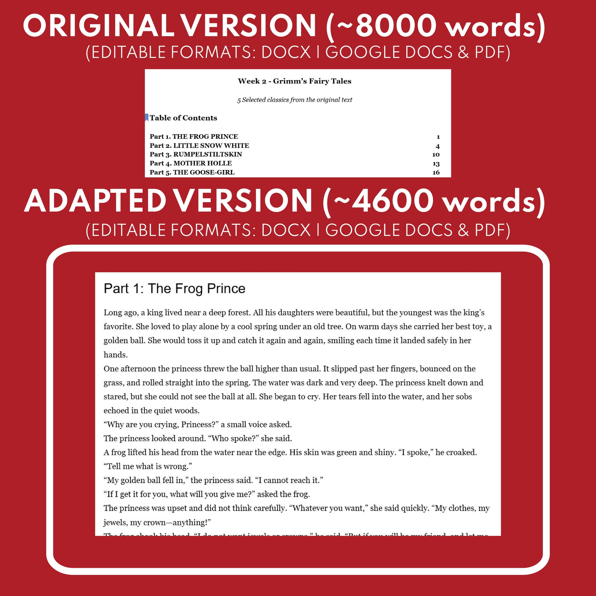 SOLUTION: This differentiated study guide for Grimm’s Fairy Tales (Week 2: Most-Recognized Classics II) solves that problem by giving you both the complete original text and a condensed, five-part adapted version, so your class can move together while students read at the level that fits. The adaptation keeps the major plot events, character choices, and core themes so your discussions stay meaningful and text-based.