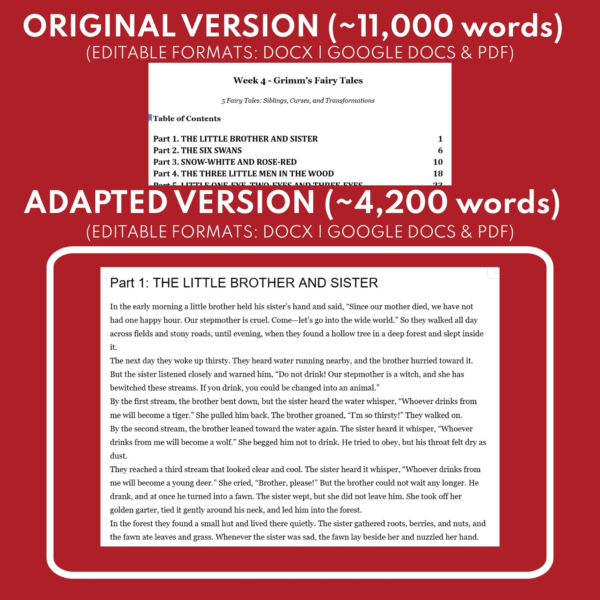 SOLUTION: This differentiated study guide for Grimm’s Fairy Tales (Week 4: Siblings, Curses, and Transformations) solves that problem by giving you both the complete original text and a condensed, five-part adapted version, so your class can move together while students read at the level that fits. The adaptation keeps the major plot events, character choices, and core themes so your discussions stay meaningful and text-based.