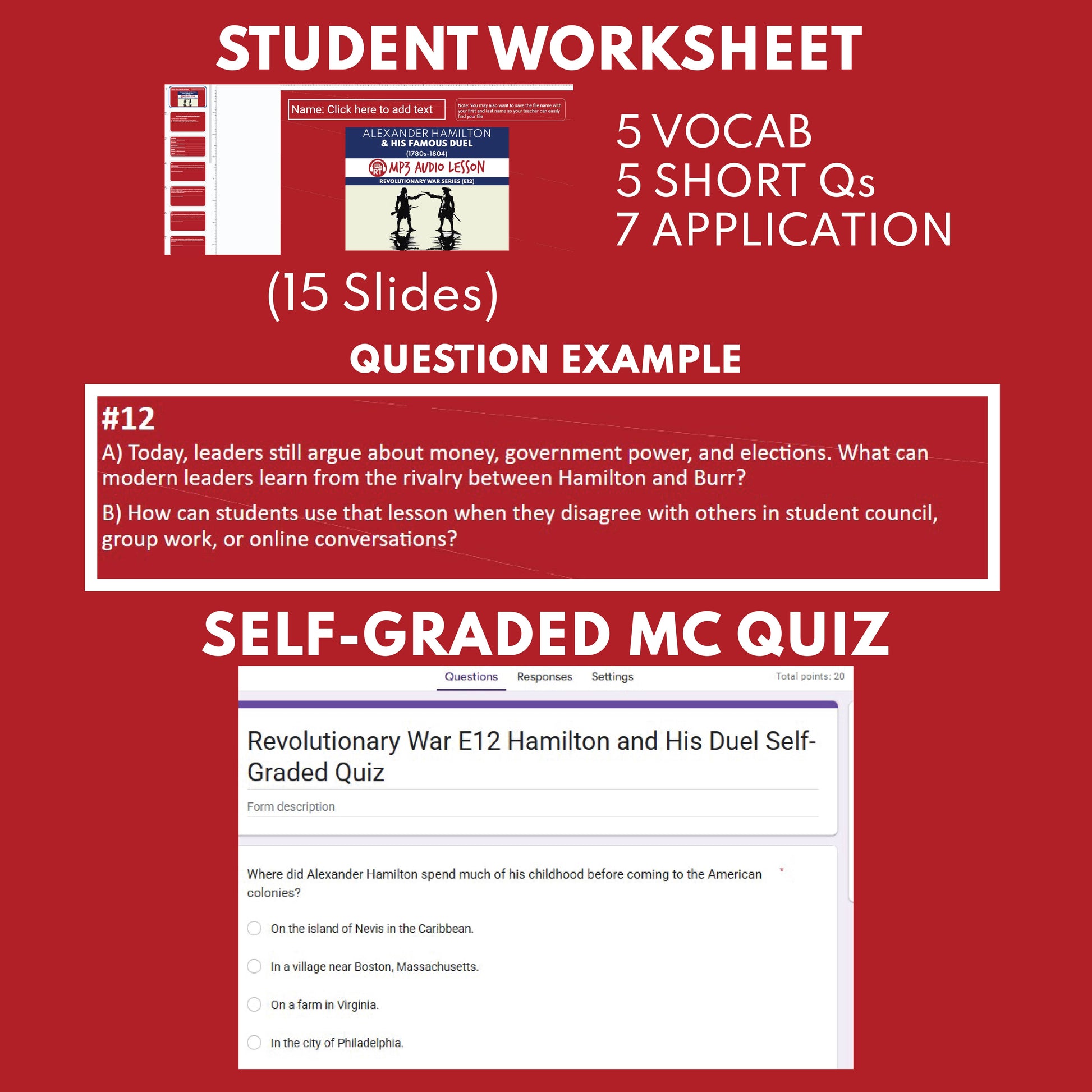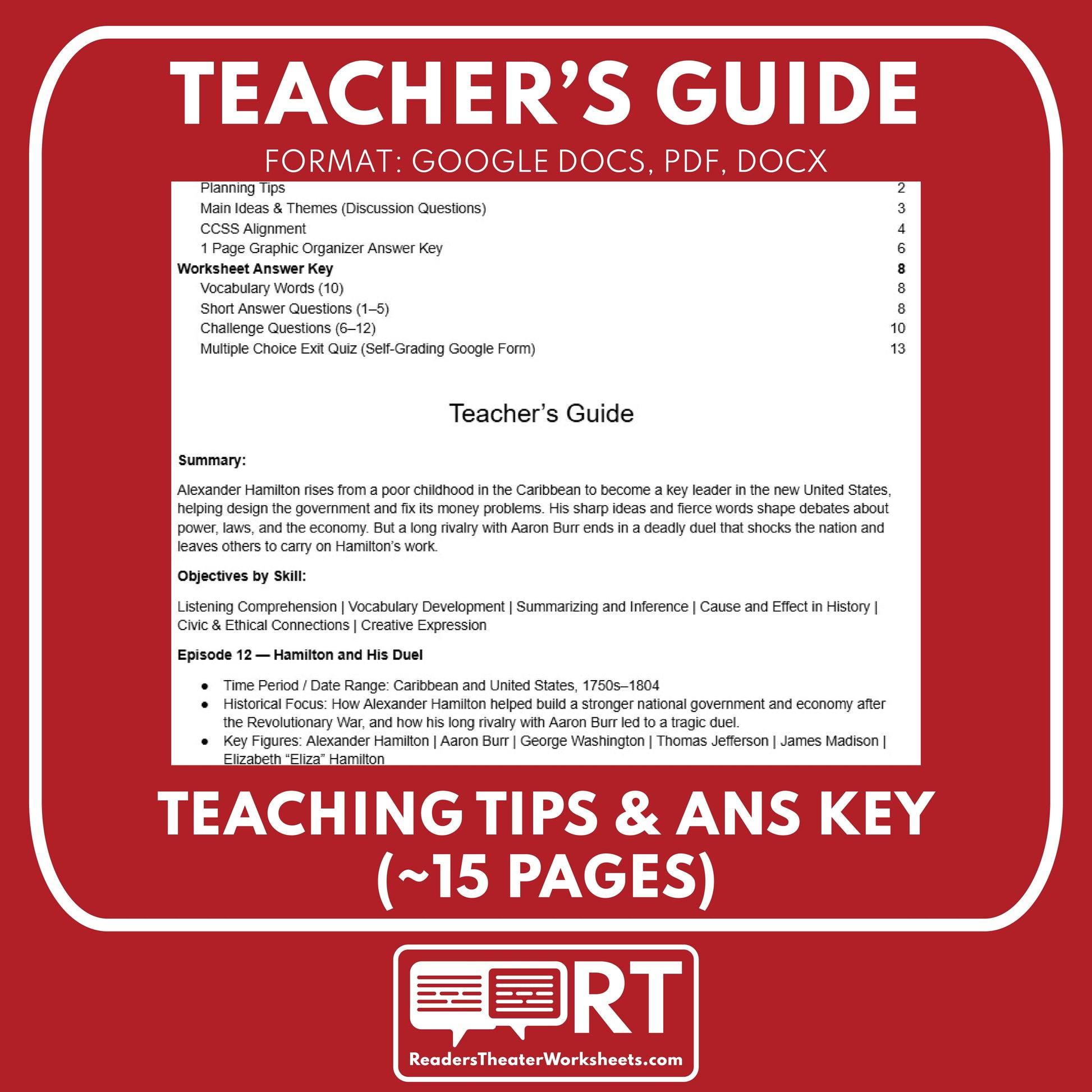Use this audio mini-lesson when you want to connect biography, government, and character choices in a single resource. It helps students see both Hamilton’s contributions to the young nation and the warning his story gives about pride, conflict, and letting disagreements turn dangerous, with structured questions and a compare-and-contrast organizer to support deeper reflection.
