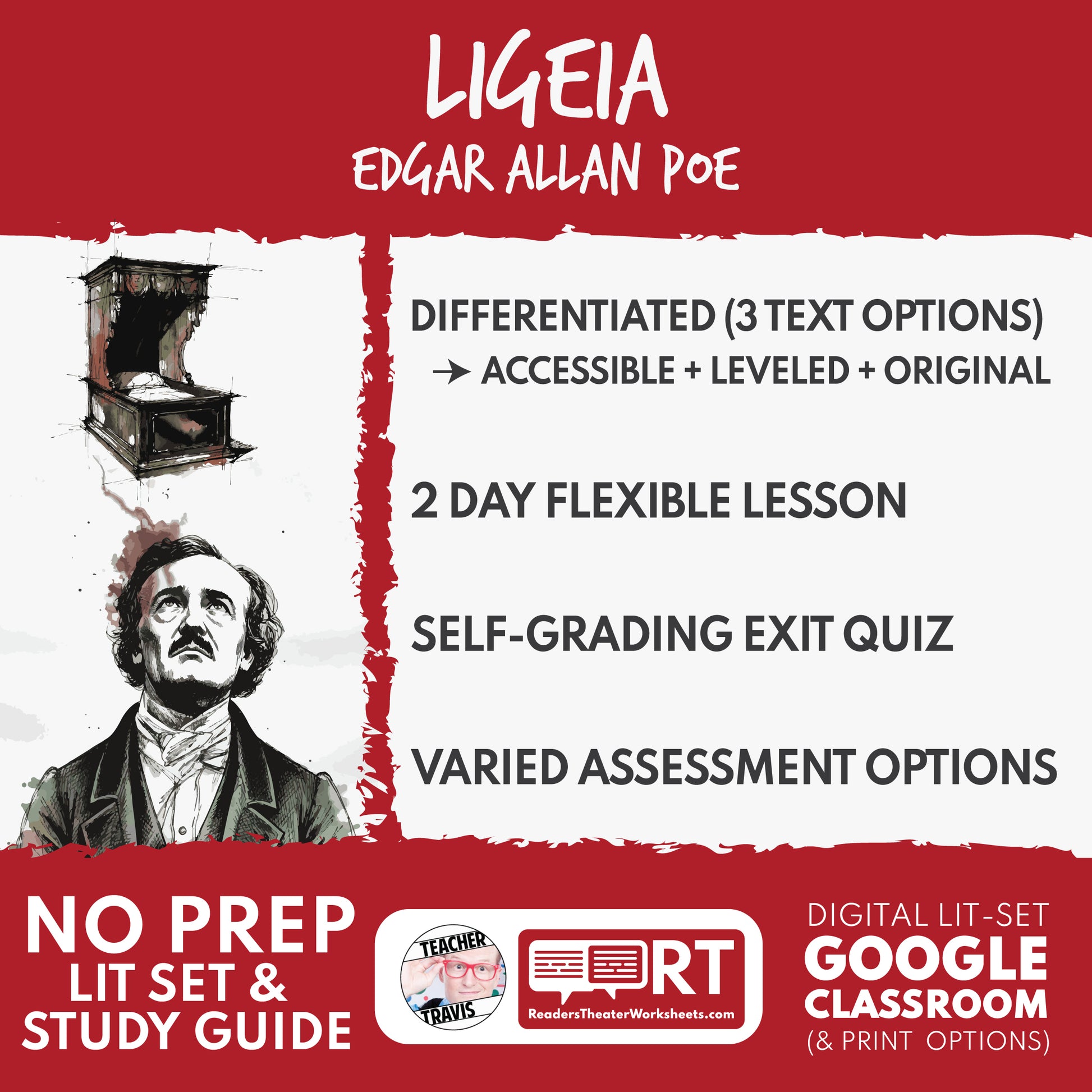 A differentiated Edgar Allan Poe study guide for Ligeia with 3 text levels (Accessible/HILO, Leveled, Original) so every student can join the same discussion and 10-question exit quiz.