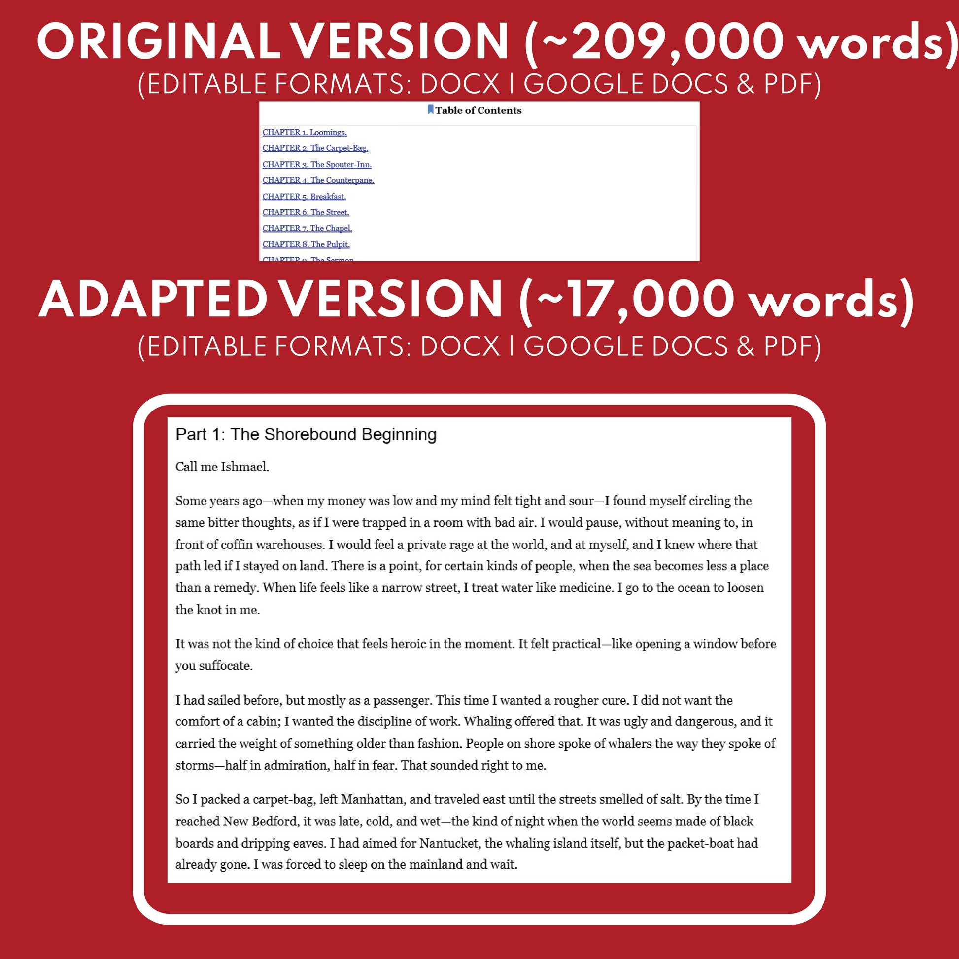 Here’s the solution: This differentiated novel study / digital lit-set for Moby-Dick by Herman Melville solves that problem by giving you both the complete original text and a condensed, five-part adapted version, so you can keep the class moving together while students read at the level that fits.