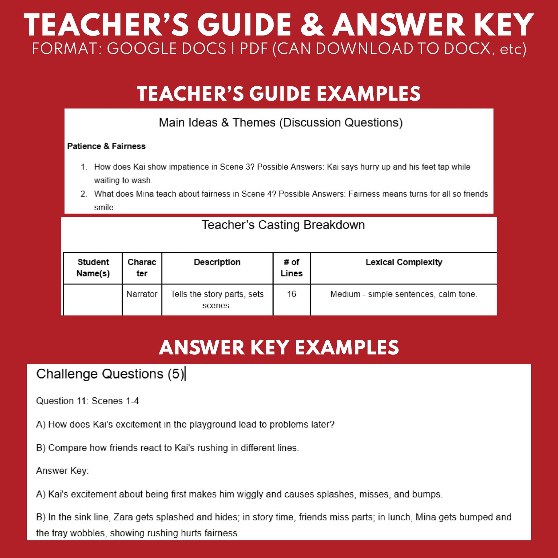 - Teacher Guide: ~10 pages, scene summaries, primary source context, discussion questions, standards alignment, answer keys (editable Google Doc/PDF)