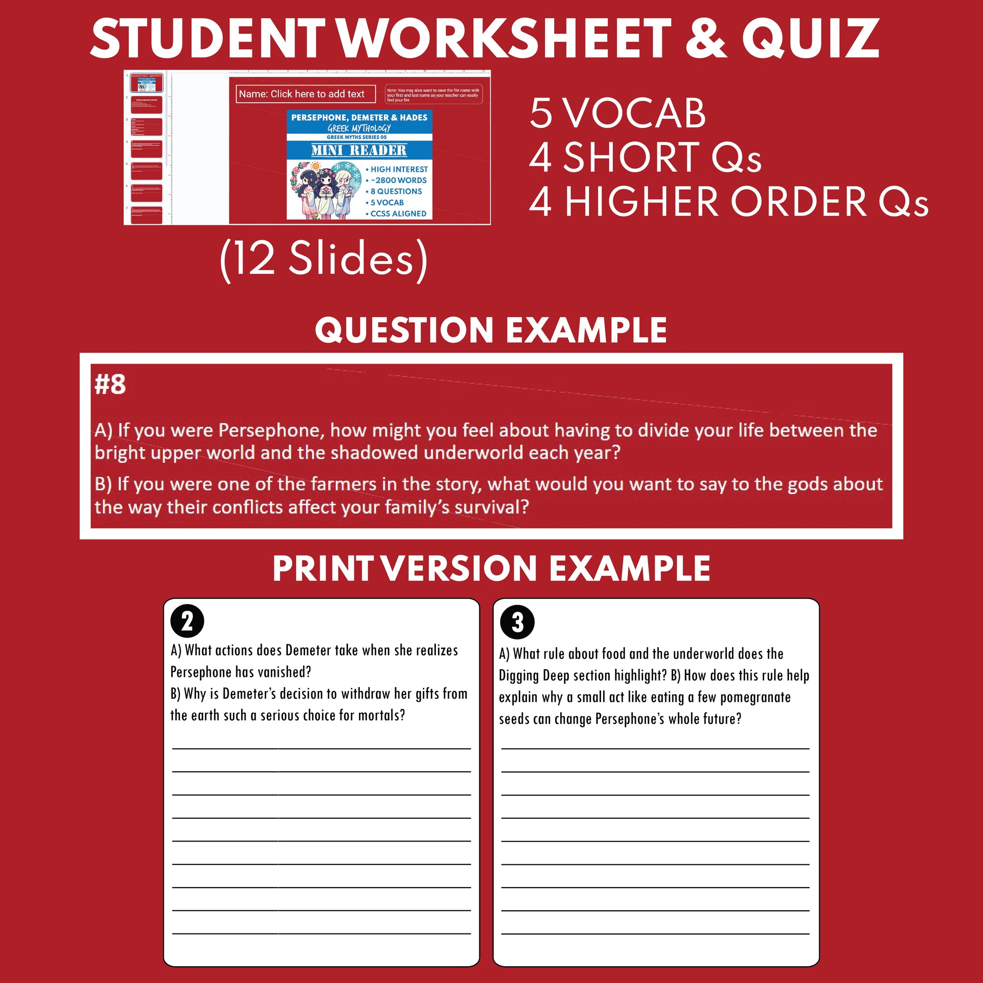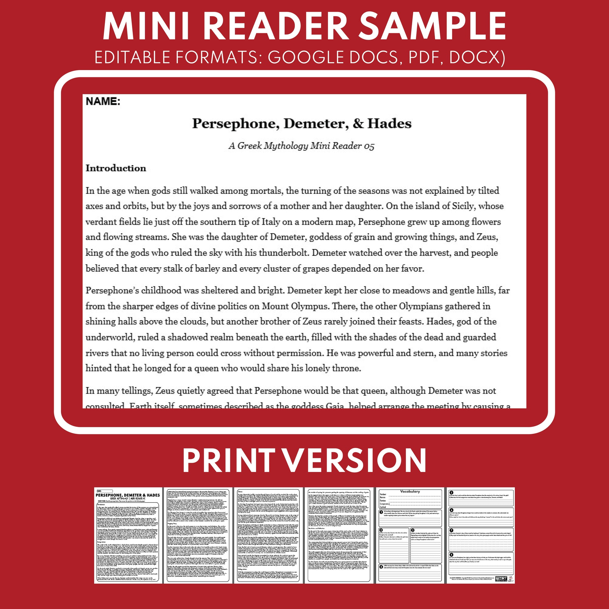 This Greek Mythology Reading Resource “Mini Reader” is based on the myth of Demeter and Persephone, retelling how the abduction of a daughter, a mother’s grief, and a difficult compromise between gods reshape the seasons. Set in Sicily, the underworld, Mount Olympus, and Eleusis, the narrative blends vivid storytelling with short explanatory pauses so students can see how gods, rulers, and ordinary farmers are connected.
