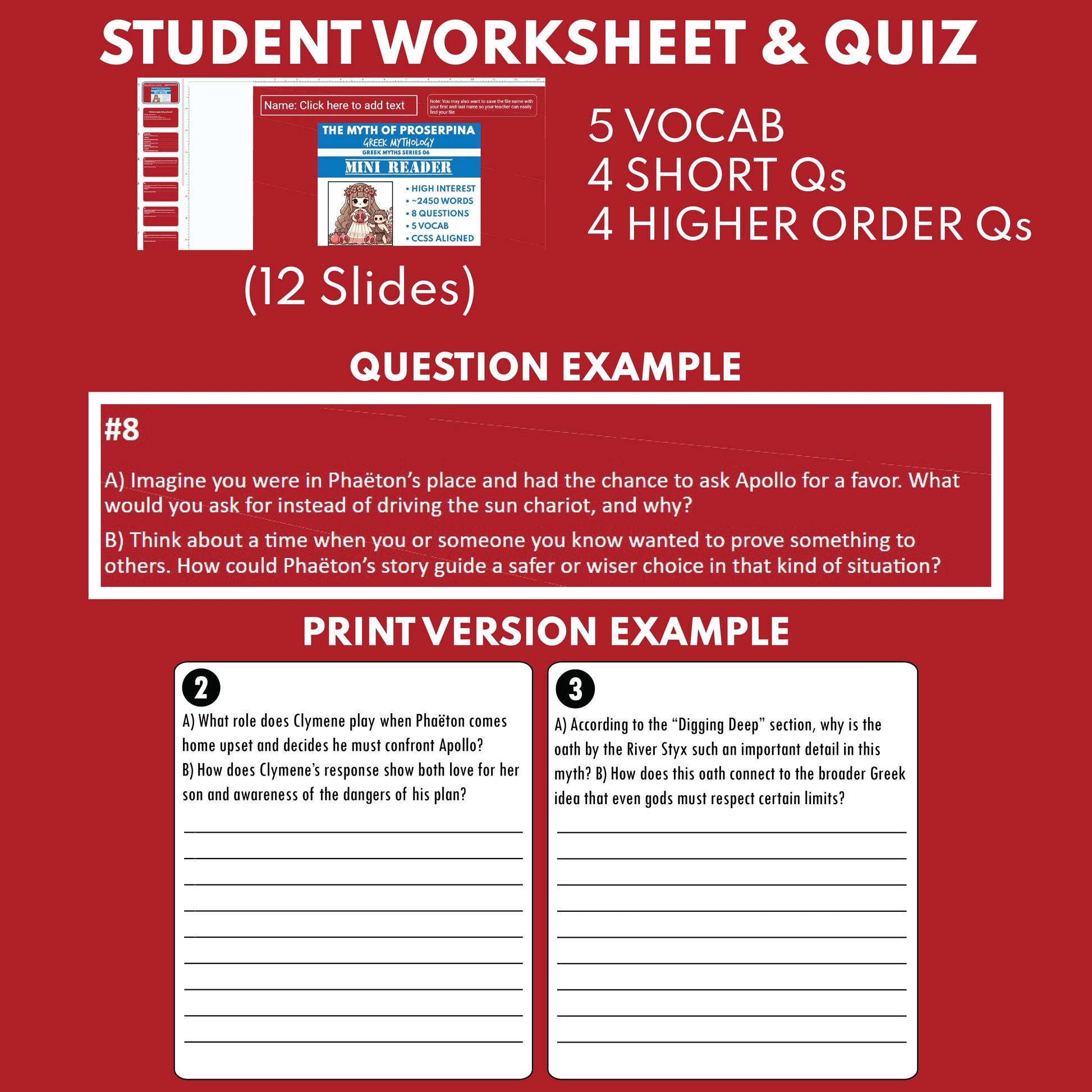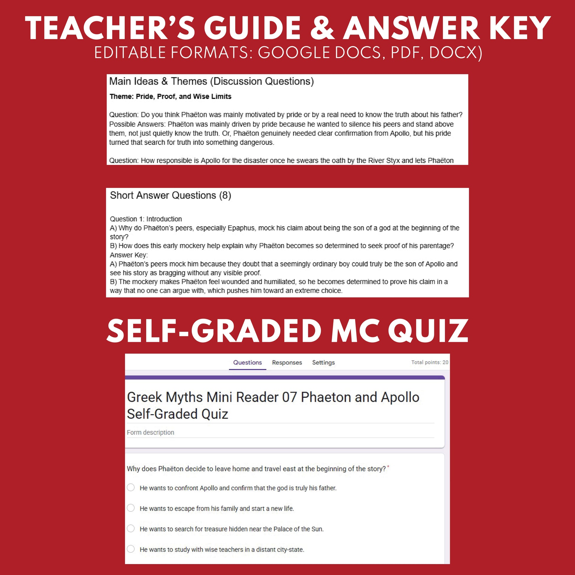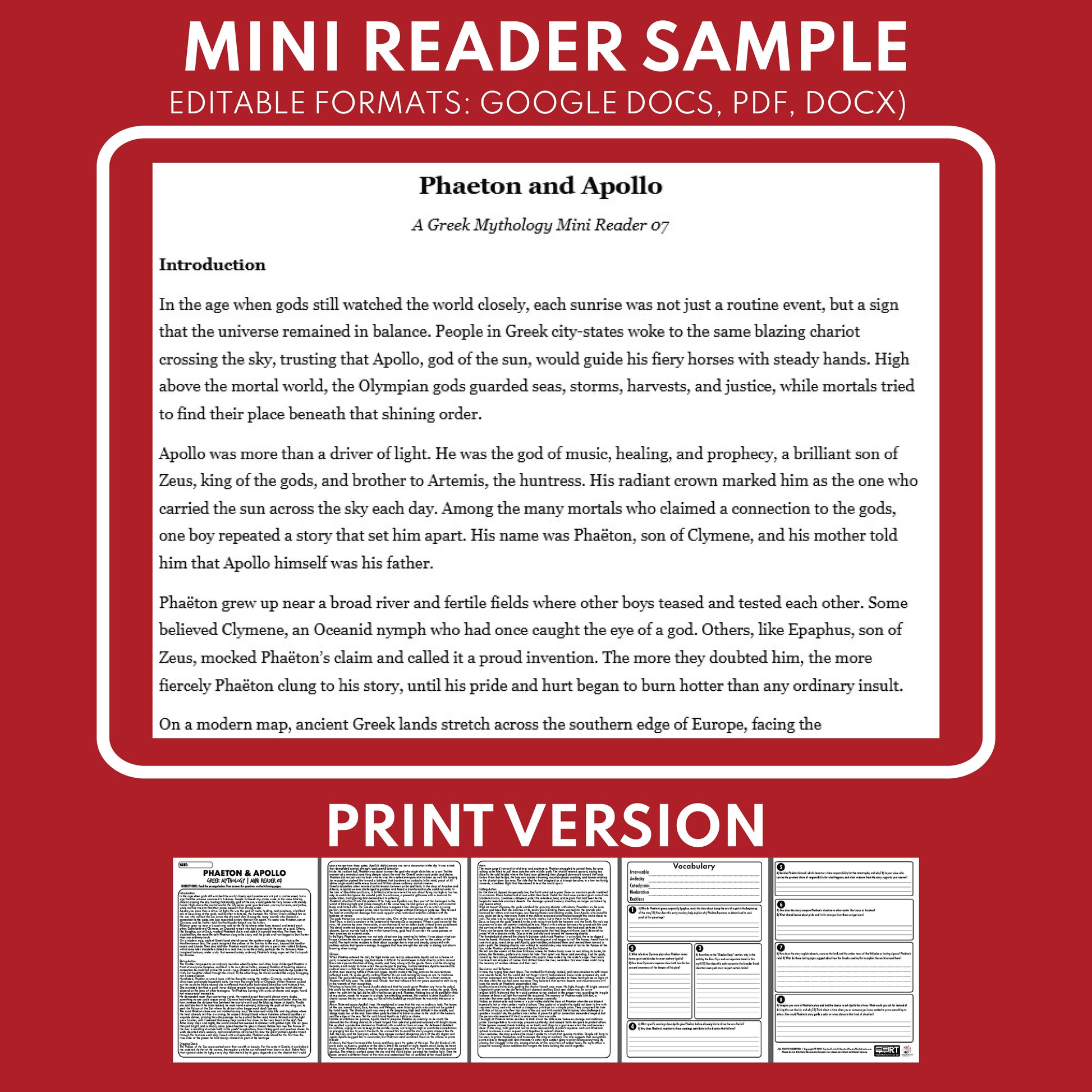 This Greek Mythology Reading Resource “Mini Reader” is based on the myth of Phaëton and Apollo’s chariot, retelling how a mortal son’s quest to prove his divine heritage leads him to demand control of the sun chariot and nearly burn the world. Set between Greek lands, the distant Palace of the Sun, and the sky’s dangerous middle path, the narrative blends vivid storytelling with short explanatory pauses so students can see how gods, kings, heroes, and ordinary people are connected.