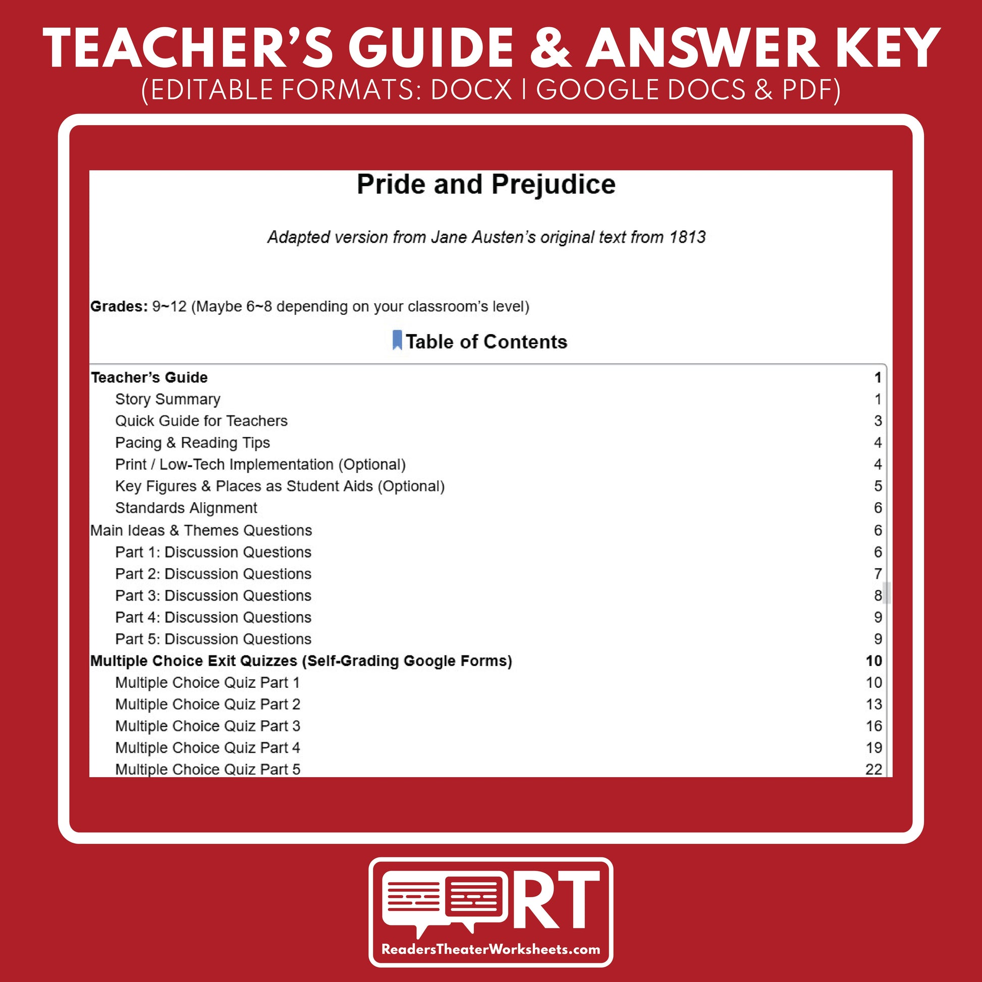 Here’s the solution: This differentiated novel study (digital lit-set) solves that problem by giving you both tracks in one complete unit: the full original Pride and Prejudice text and a streamlined adapted five-part version for faster pacing and stronger accessibility. You get a stable, part-for-part chapter map (Parts 1–5) so students can read different versions while staying aligned to the same instruction, discussions, and assessments.