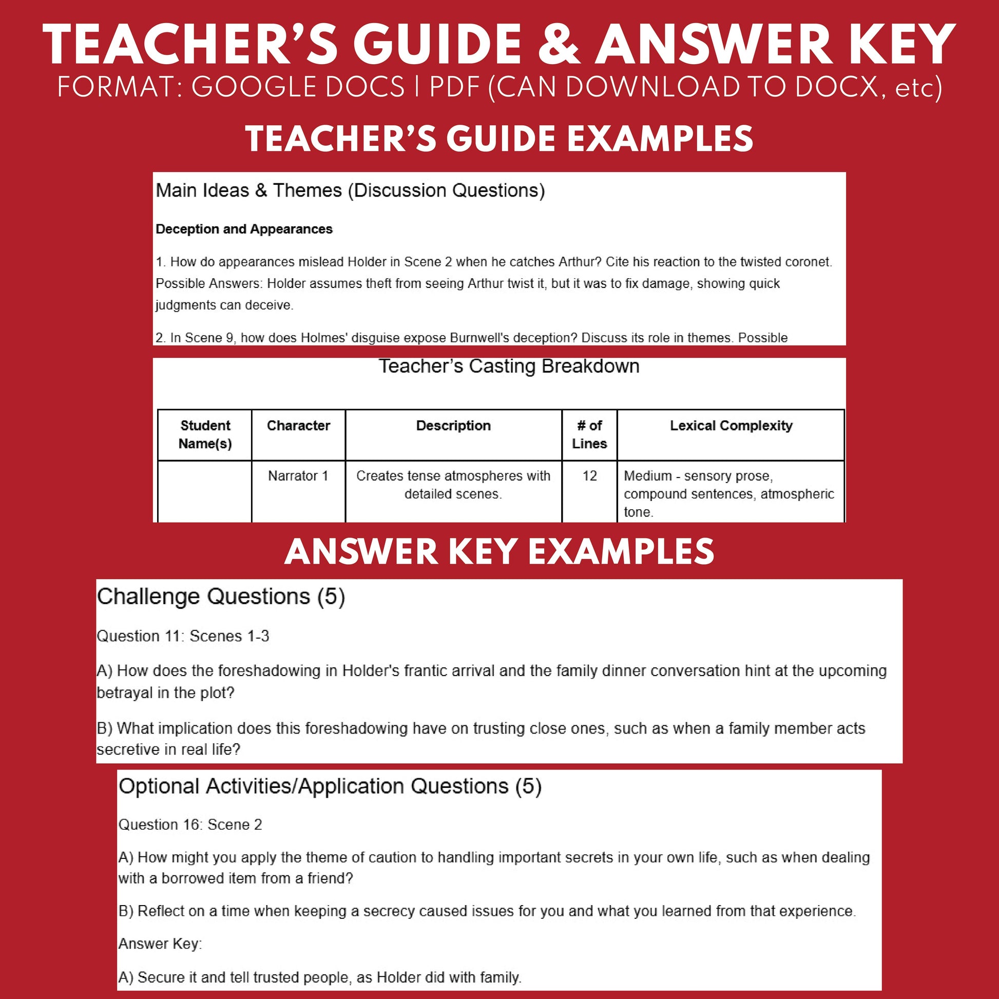 - Teacher Guide (~18 pages): scene summaries, notes, discussion prompts, alignment, keys
