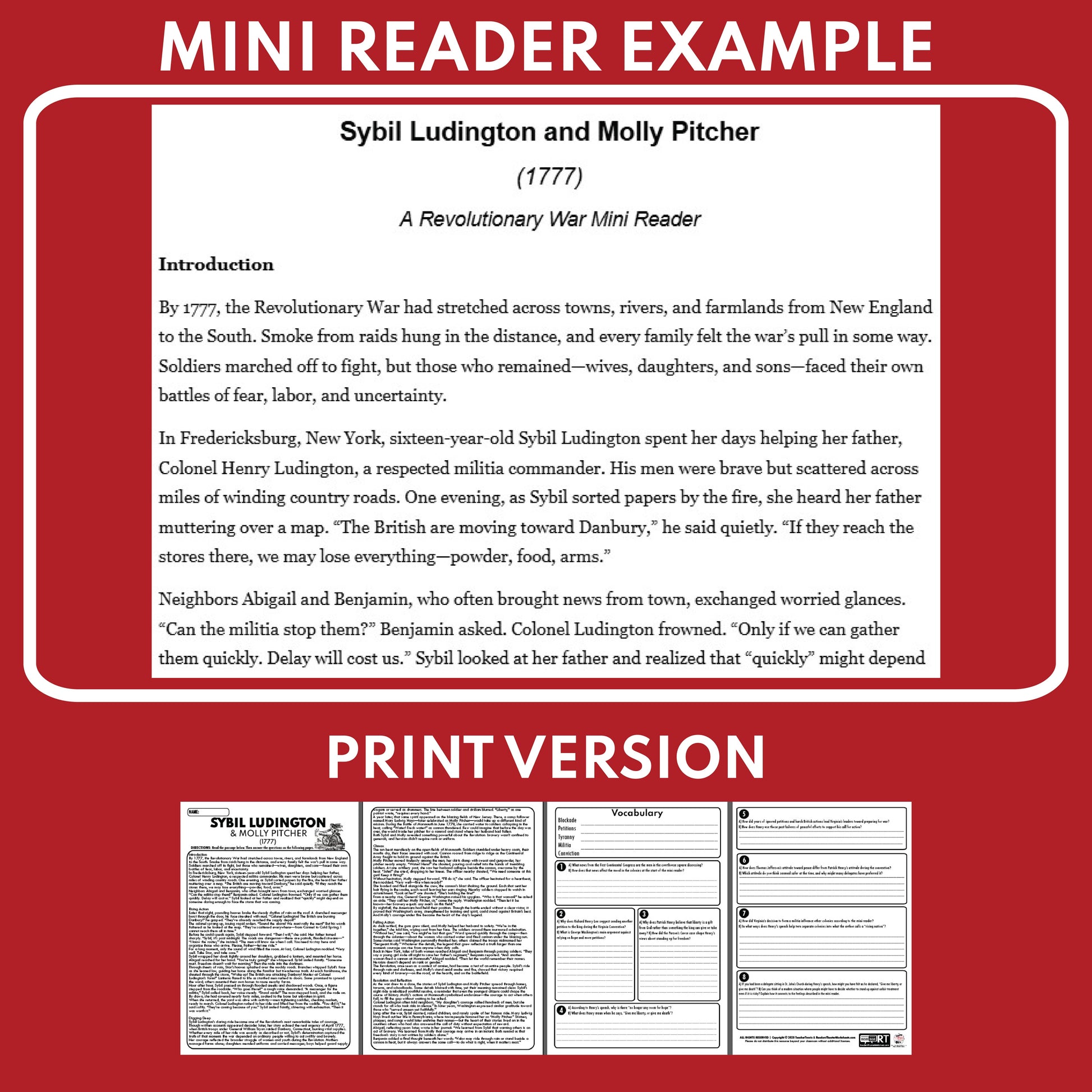 This U.S. History Reading Resource “Mini Reader” is based on Sybil Ludington and Molly Pitcher and tells the story of how women and young people took brave, unexpected roles in the Revolutionary War. In April 1777, sixteen-year-old Sybil Ludington rides through a stormy night in New York to warn scattered militiamen that the British are attacking the supply depot at Danbury. Her long, dangerous ride helps rally local forces in time. A year later, in June 1778, Mary Ludwig Hays—remembered as Molly Pitcher—carries water to exhausted soldiers at the Battle of Monmouth and then steps in to man a cannon when her husband collapses in the intense heat.