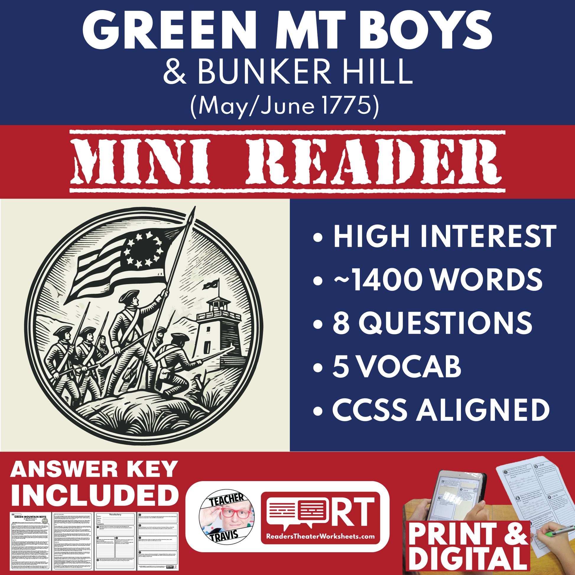 This U.S. History Reading Resource “Mini Reader” is based on The Green Mountain Boys and the Battle of Bunker Hill and it tells the story of how early colonial victories and sacrifices in 1775 changed the course of the American Revolution. After the first shots at Lexington and Concord, colonists knew that words alone would not protect their homes. Ethan Allen and his Green Mountain Boys carried out a daring nighttime raid on Fort Ticonderoga to capture British cannons and control a key route to Canada, while British leaders prepared to crush resistance around Boston by seizing the high ground.