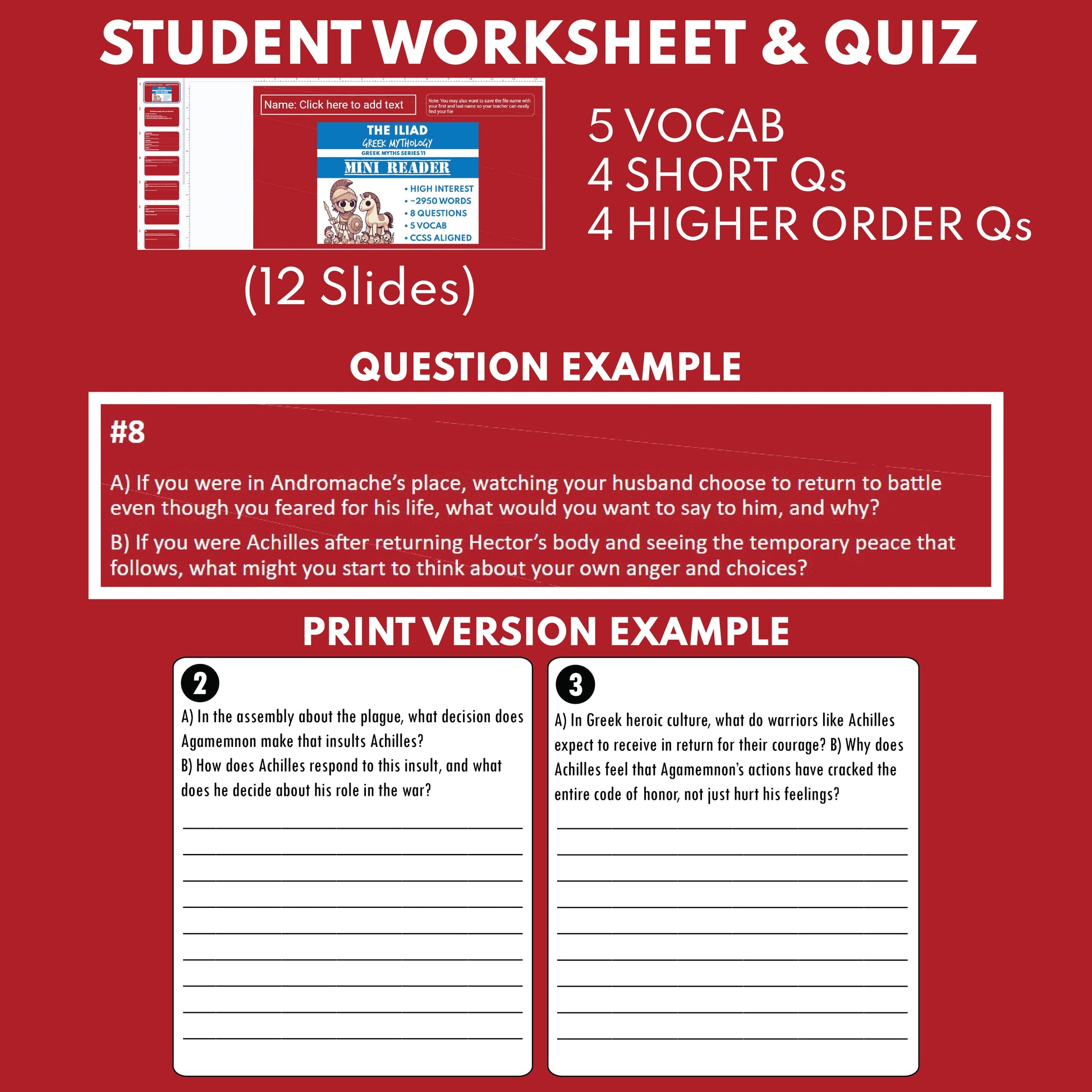 This Greek Mythology Reading Resource “Mini Reader” is based on the myth of the Iliad, retelling how the wrath of Achilles, the duty of Hector, and the grief of King Priam collide around the walls of Troy. Set around the besieged city on the northwest coast of modern Turkey, the narrative blends vivid battlefield scenes and city life with short explanatory pauses so students can see how gods, kings, warriors, and families are all connected.