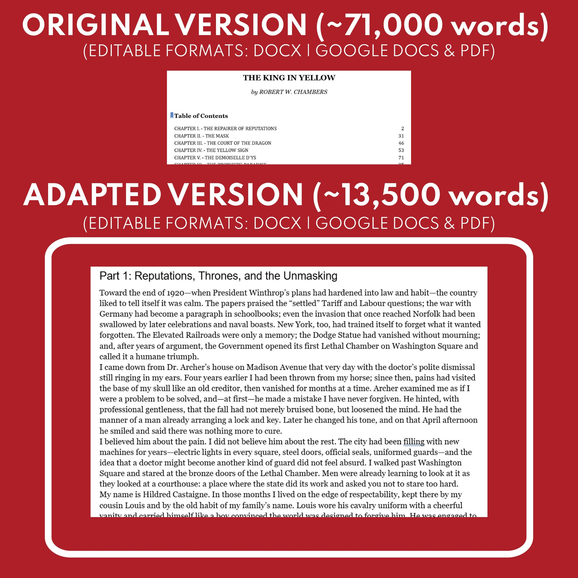 SOLUTION: This differentiated novel study for The King in Yellow solves that problem by giving you both the complete original text and a condensed, five-part adapted version, so you can keep the class moving together while students read at the level that fits.