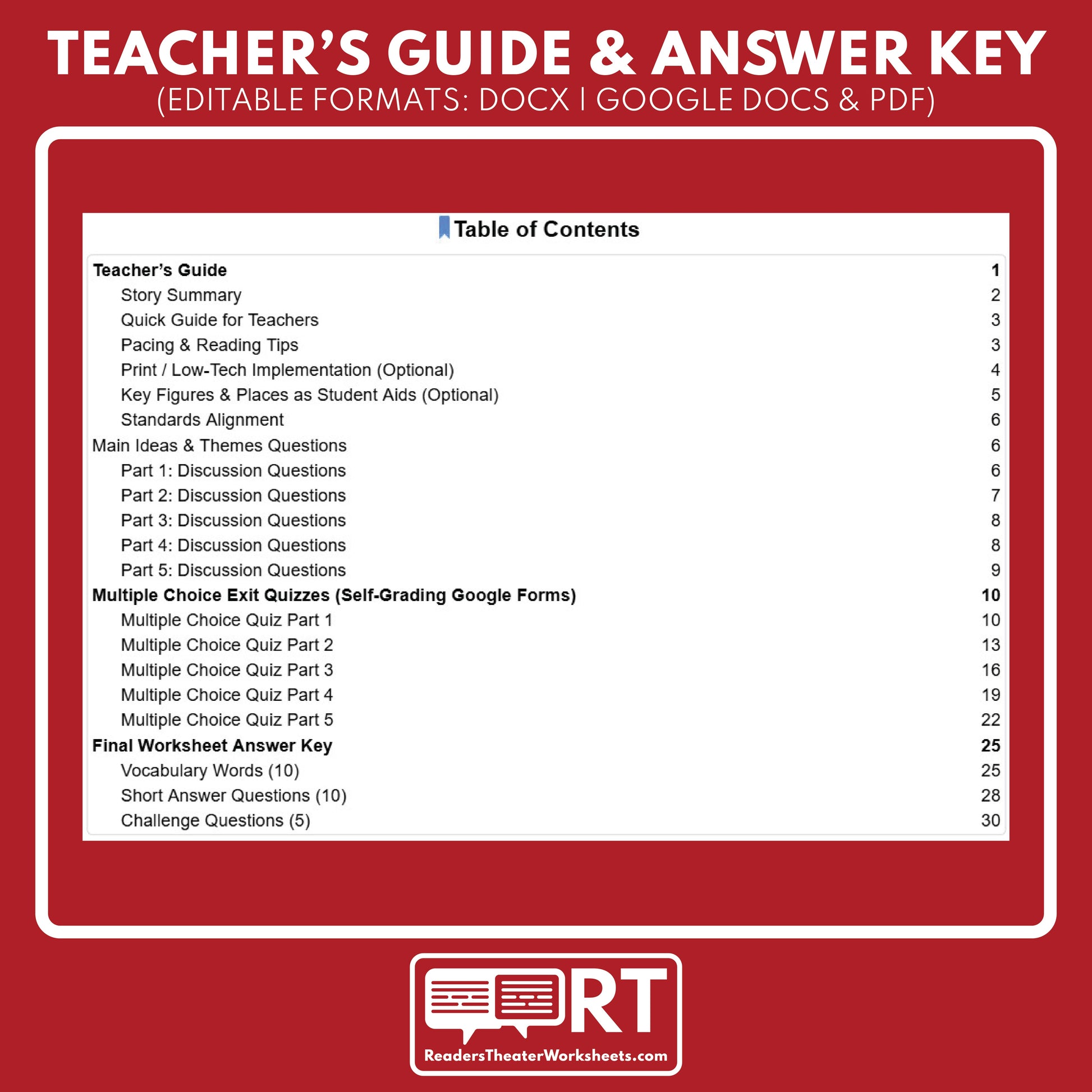 - All assessments are usable for both tracks: Discussion Questions, MC Exit Quizzes for each Part, and the Final Worksheet (Vocabulary, Short Answer, and Challenge Questions).