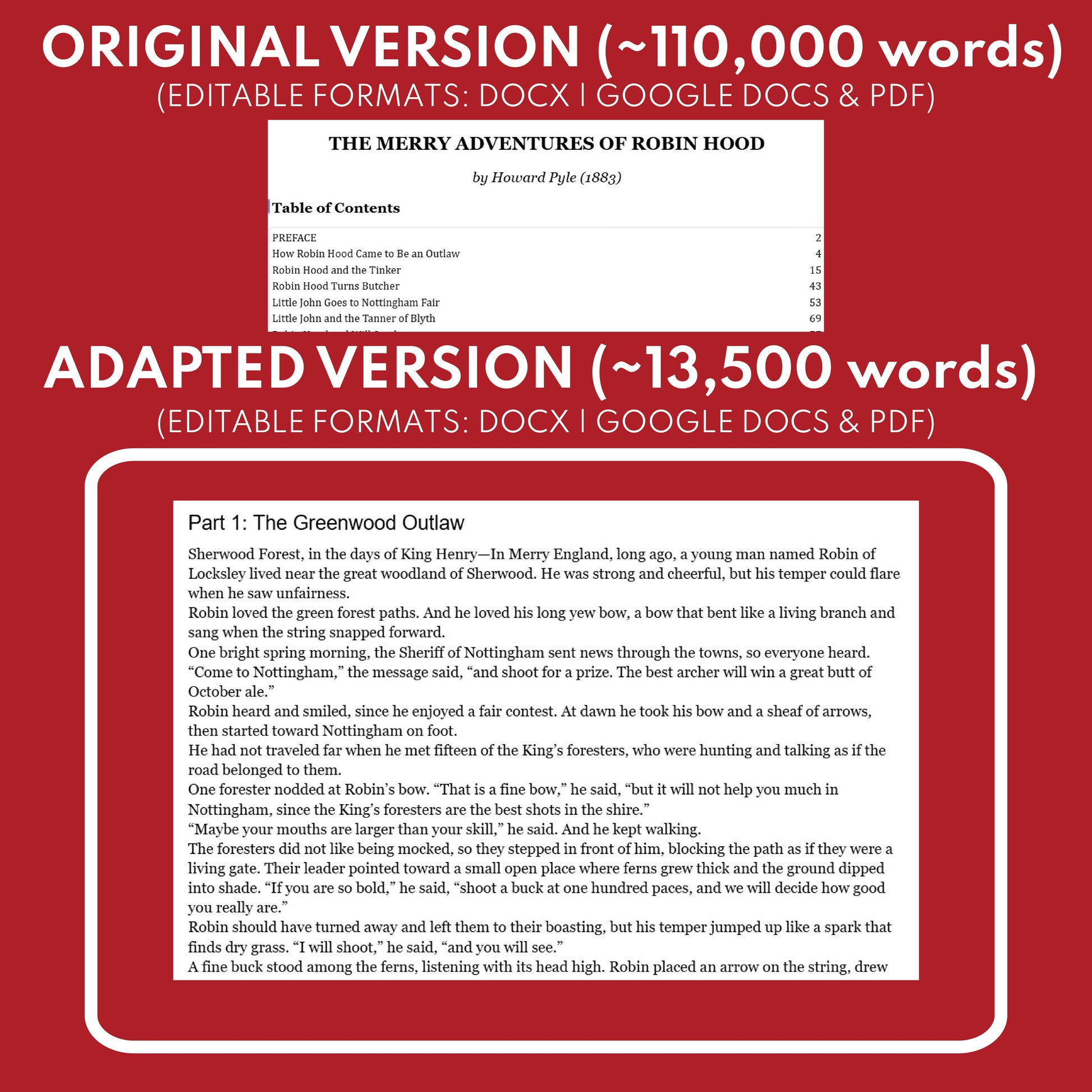 SOLUTION: This differentiated novel study for The Merry Adventures of Robin Hood solves that problem by giving you both the complete original text and a condensed, five-part adapted version, so your class can move together while students read at the level that fits. The adaptation keeps the major plot events, character choices, and core themes so your discussions stay meaningful and text-based.
