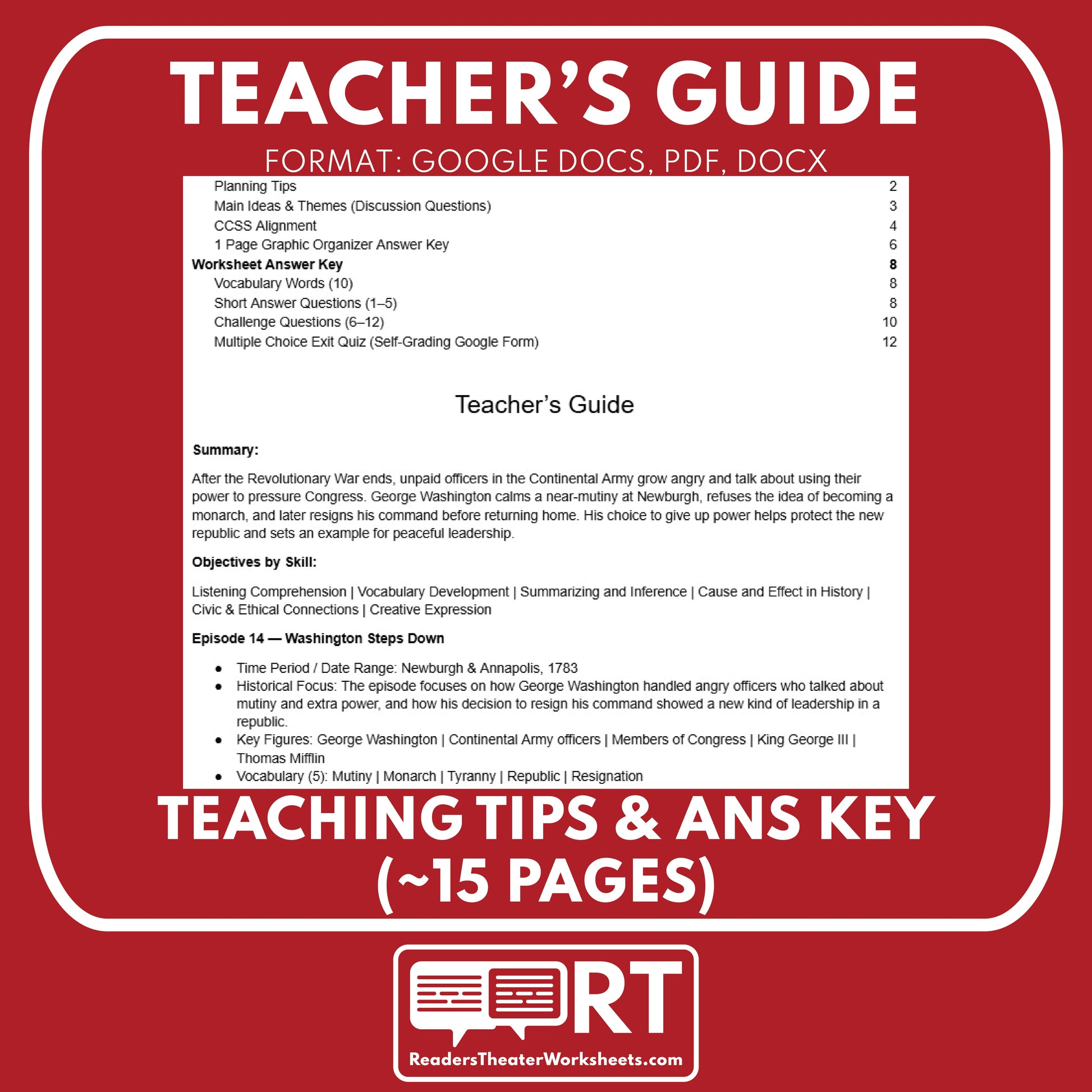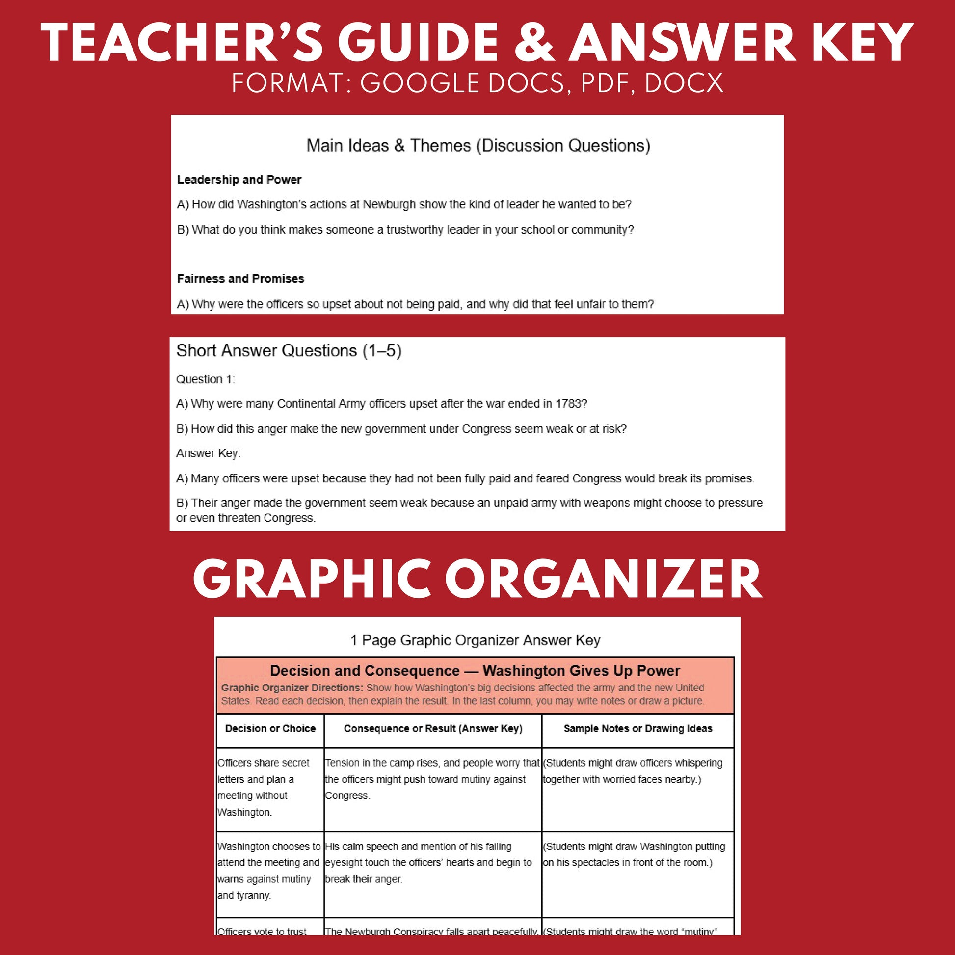 Use this Revolutionary War audio mini-lesson when you want to focus on leadership, power, and peaceful transitions. It gives students a clear narrative for the Newburgh Conspiracy and Washington’s resignation, plus an organizer and prompts that ask what it means to give up power at the right time so that laws and elected leaders stay in charge.