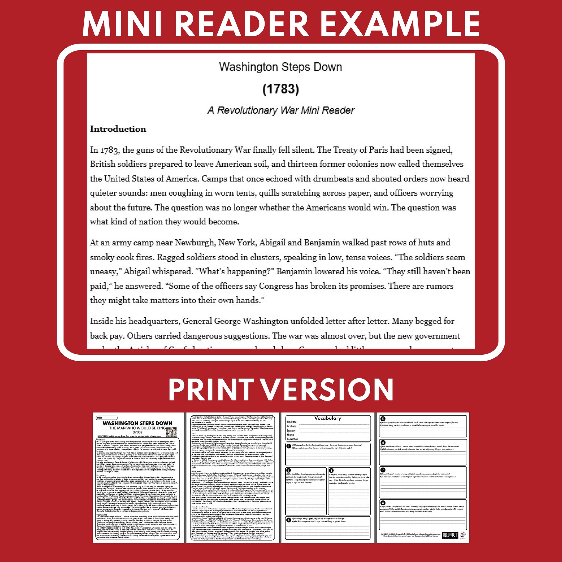 This U.S. History Reading Resource “Mini Reader” is based on Washington Steps Down: The Man Who Would Be King (1783) and tells the remarkable story of how George Washington refused power after winning the Revolutionary War. When unpaid soldiers and officers whispered about rebellion and even offered to make him king, Washington’s courage and humility prevented disaster. His calm leadership at Newburgh and his voluntary resignation before Congress in Annapolis showed the world that the new nation would be ruled by laws, not by generals.
