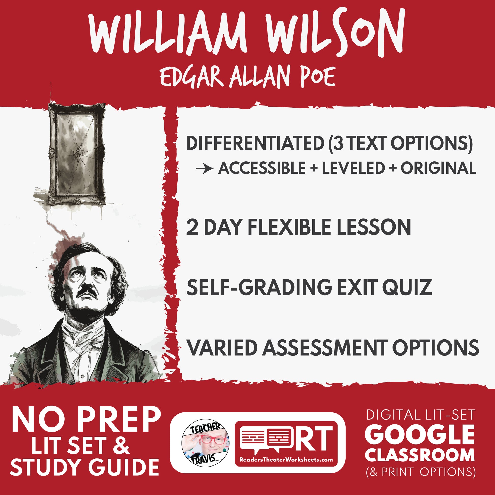 A differentiated Edgar Allan Poe study guide for William Wilson with 3 text levels (Accessible/HILO, Leveled, Original) so every student can join the same discussion and 10-question exit quiz.