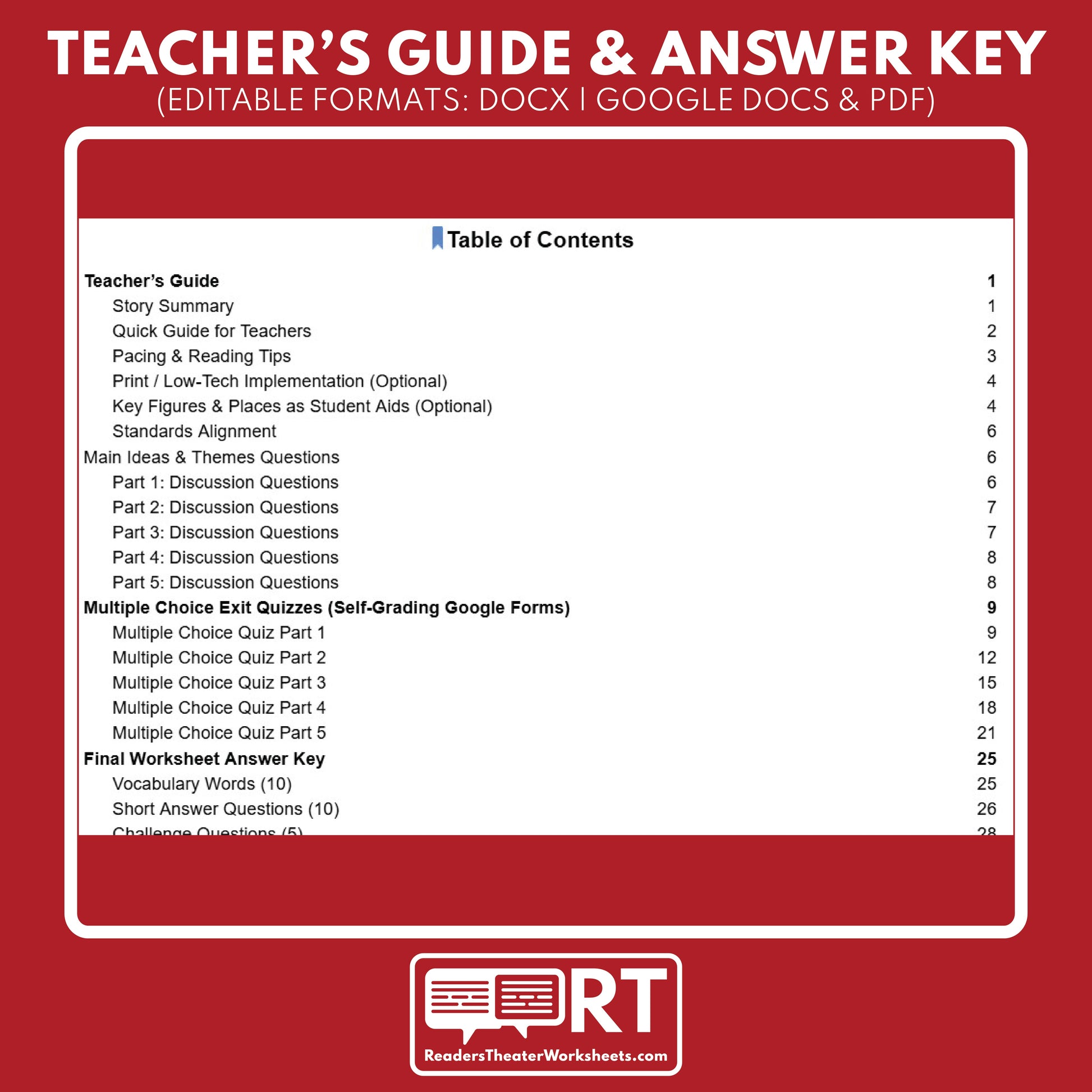 - Day 1–5: Students read one adapted part per day and use the matching Main Ideas & Themes Discussion Questions and self-grading multiple-choice quiz.