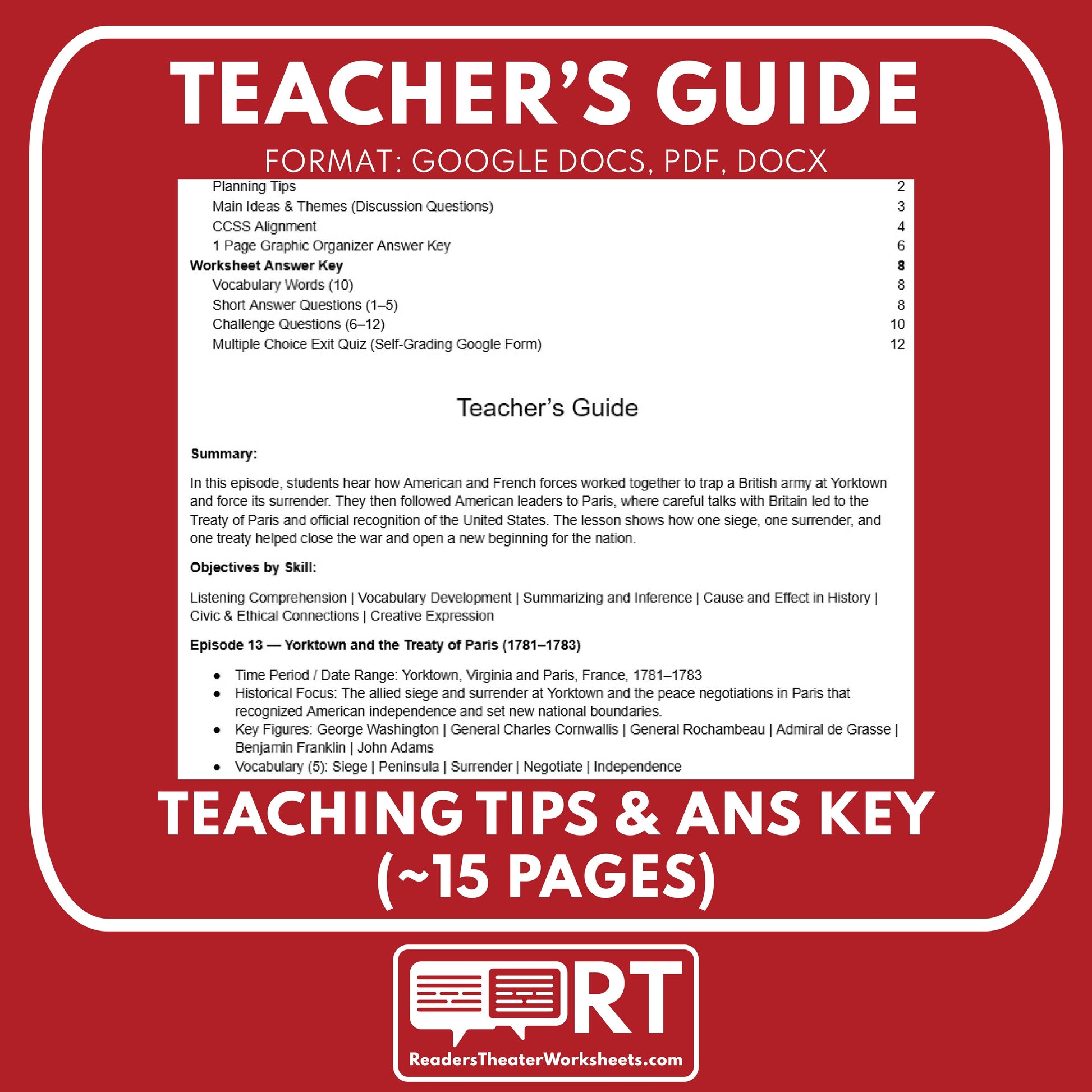 Use this Revolutionary War audio mini-lesson when you want students to connect battlefields and treaty tables in the same story. It provides a clear overview of allied strategy at Yorktown and the patient negotiation in Paris, along with a graphic organizer and questions that help students think about leadership, alliances, and what it means to end a war responsibly.